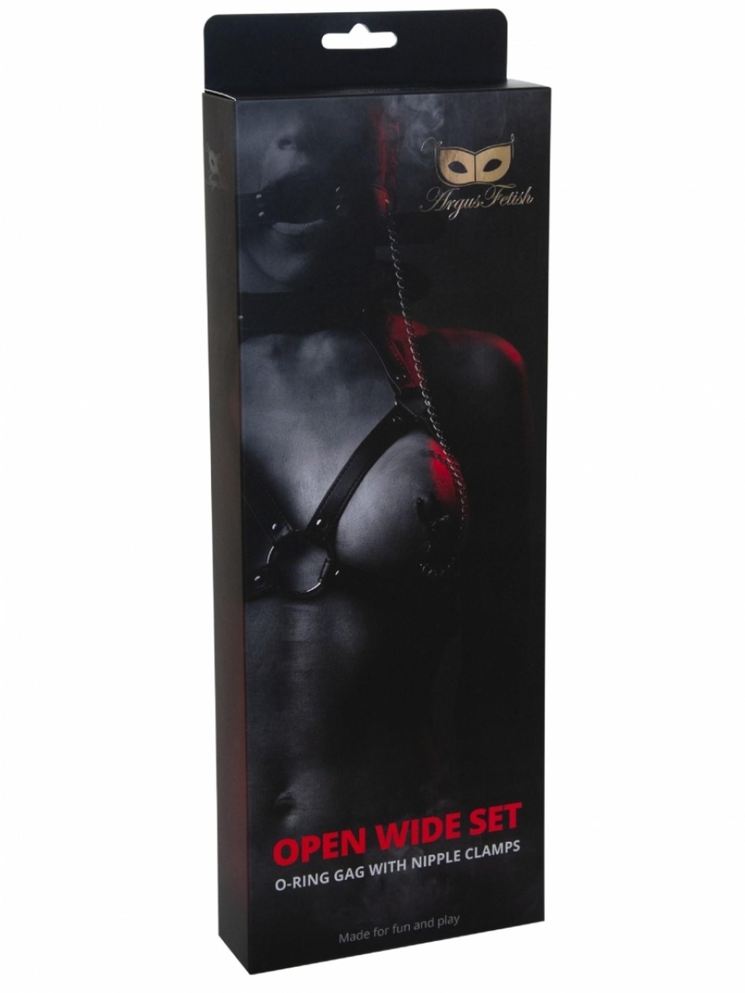 Zestaw uprzęży na piersi, metalowe zaciski na sutki i knebel z otwartą buzią. Knebel i uprząż mają regulowany rozmiar za pomocą metalowej klamry. Klamry mają osłony z PCV chroniące skórę. Ciśnienie można regulować za pomocą śrub, co zapewnia najwyższą kontrolę ściśnięcia.