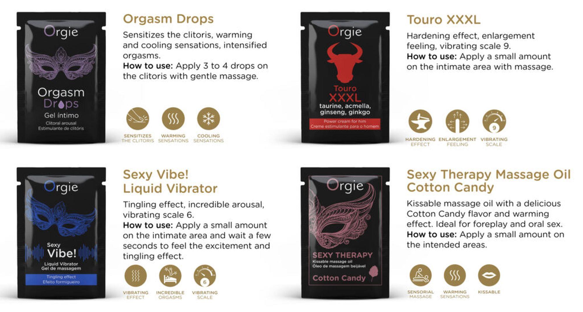 Zestaw do zabawy to połączenie 4 bestsellerów Orgie w saszetkach o pojemności 2 ml, zaprojektowanych jako idealny wybór na romantyczny wypad, miły prezent lub wypróbowanie produktów Orgie.