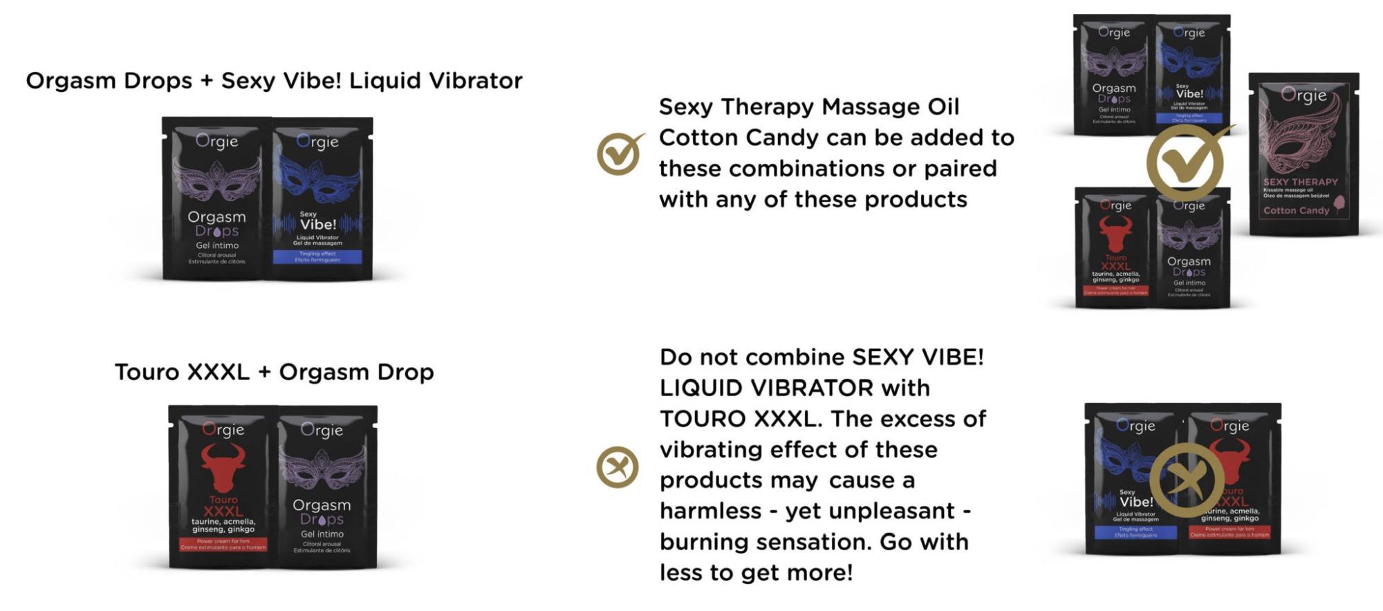 *Zawiera saszetki: 1 Orgasm Drops, 1 Touro XXXL, 1 Sexy Vibe! Liquid Vibrator, 1 Sexy Therapy kissable Massage Oil Cotton Candy.