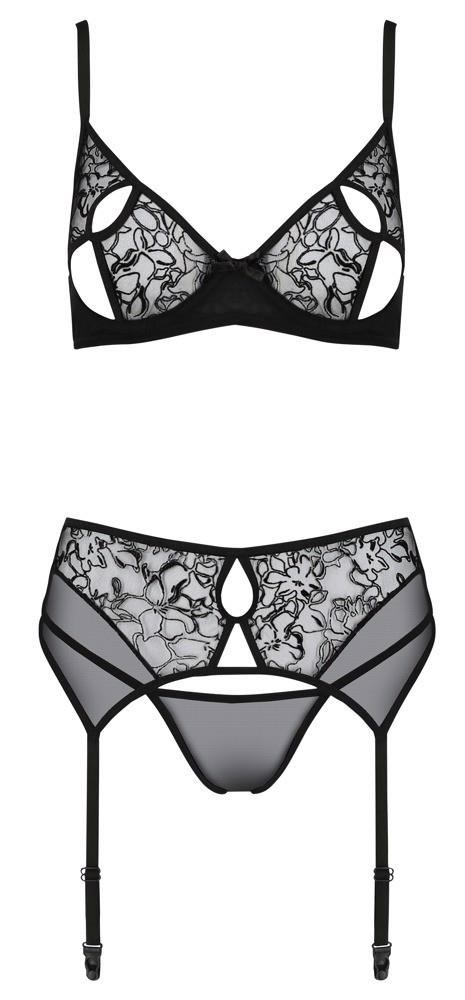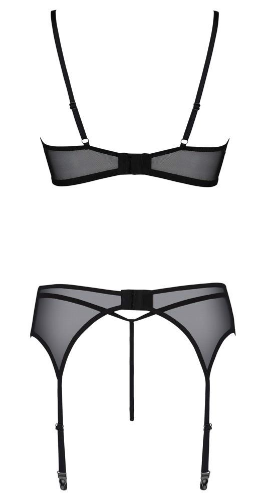 Biustonosz na fiszbinach, pas do pończoch i stringi w komplecie Primula z kolekcji Eco marki Passion. Wszystkie trzy części są wykonane z przezroczystego elastycznego powernetu. Pasek do pończoch z przodu z delikatną, wypalaną koronką i dwoma wycięciami, tak jak miseczki biustonosza z fiszbinami. Obie części bielizny zapinane z tyłu na haftki, paski do pończoch i ramiączka biustonosza można regulować.