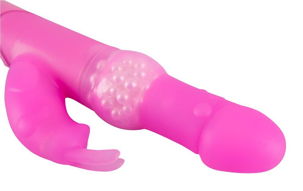 Silikonowy wibrator z króliczkiem łechtaczki wibro i ruchomymi uszami. Obrót w lewo i w prawo jest regulowany w 3 stopniach, a wibracje w 7 stopniach za naciśnięciem przycisku. Różowy. Długość całkowita: ok. 26 cm. Głębokość wsunięcia ok. 13 cm. średnica 3,1-4,4 cm. Materiał: silikon, ABS. (Prosimy zamawiać oddzielnie baterie: 3 x Mignon/AA)