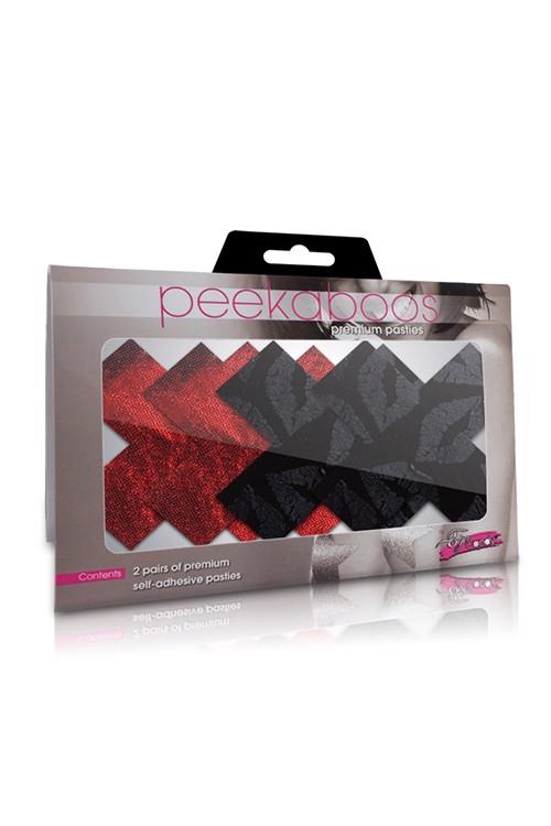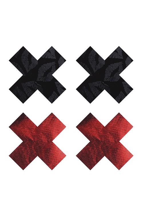 X shaped nipple pasties. 2 Pairs in metallic red and black with lip prints. Self-adhesive with peell of backs.