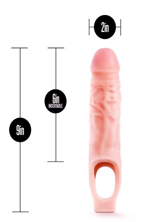 The Performance 9 Inch Cock Sheath is soft and lifelike for a realistic feel—just like your shaft, but bigger. The internal ribbing creates suction that holds the sheath securely on and delivers extra sensation to the wearer. Just insert your penis into the Performance 9 Sheath and then slide your testicles through the ball strap. This girthy sheath is perfect for extending your playtime. Made of premium TPE, it’s body safe and easy to clean.Penis extender with internal ribbing to create suction and extra sensation. Ball strap secures around ball sac for interrupted play. Increases total length plus girth. Dimensions:Insertable Length: 5.5 inches = 13,9 cmLength: 6.5 inches = 16,5 cmWidth: 1.5 inches = 3,8 cm