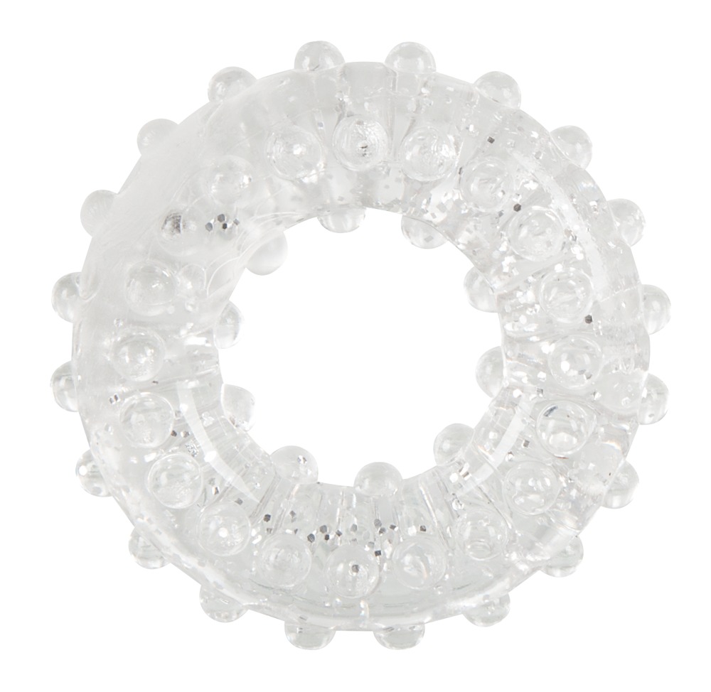 3 przezroczyste pierścienie wykonane z materiału przypominającego silikon z brokatem w środku z różnymi strukturami. Każda Ø 1,5 cm (elastyczna). Materiał: TPE.