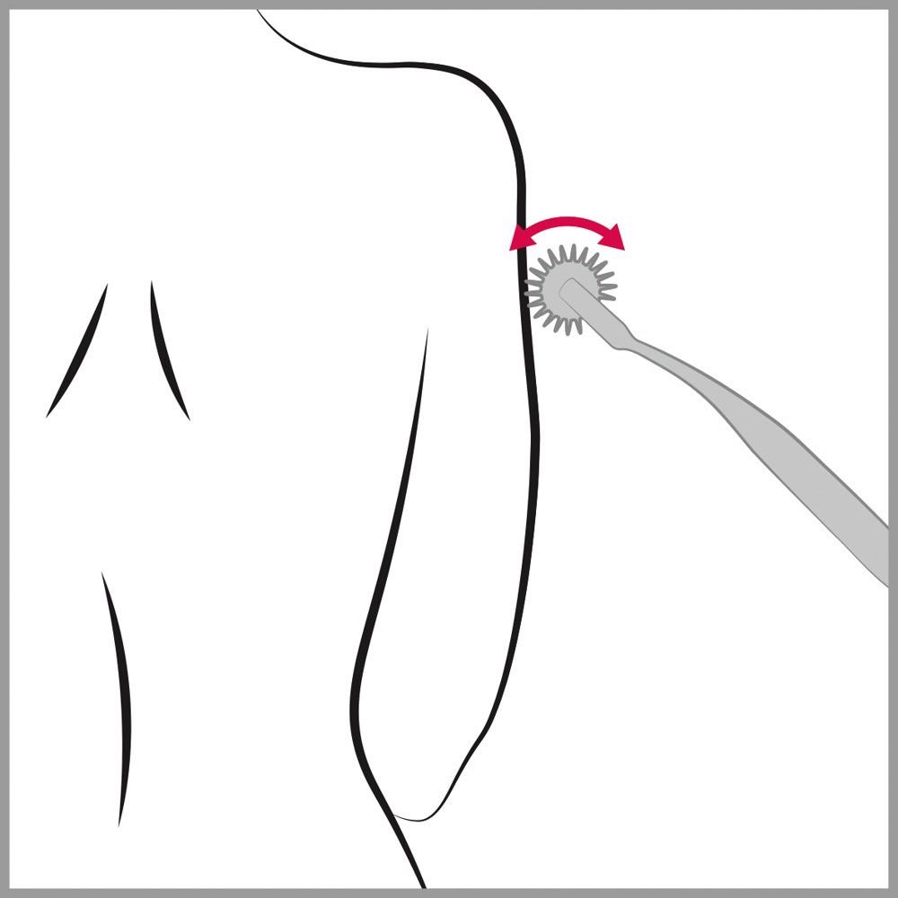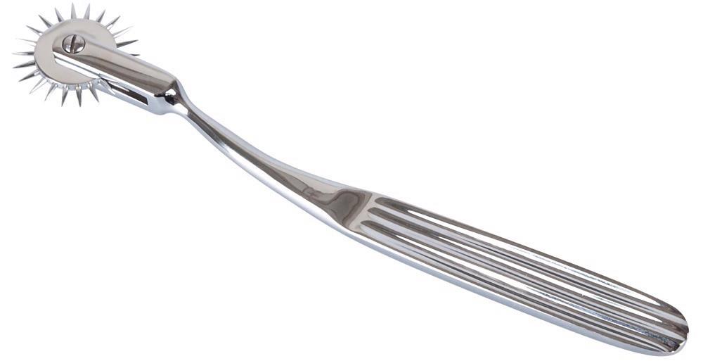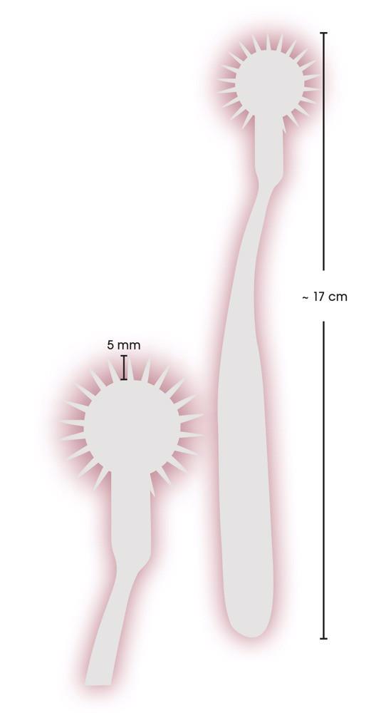Wytrzymałe kółko nerwowe Pin Wheel z kolekcji fetyszowej toczy się po skórze z większym lub mniejszym naciskiem, wywołując albo delikatnie stymulujące doznania, albo intensywny przyjemny ból. Koło wyposażone jest w małe, ostro zakończone igły i może być stosowane w dowolnym miejscu na ciele. Długi, smukły uchwyt wygodnie leży w dłoni i zapewnia optymalne prowadzenie oraz zmienny, łatwy do zastosowania nacisk.