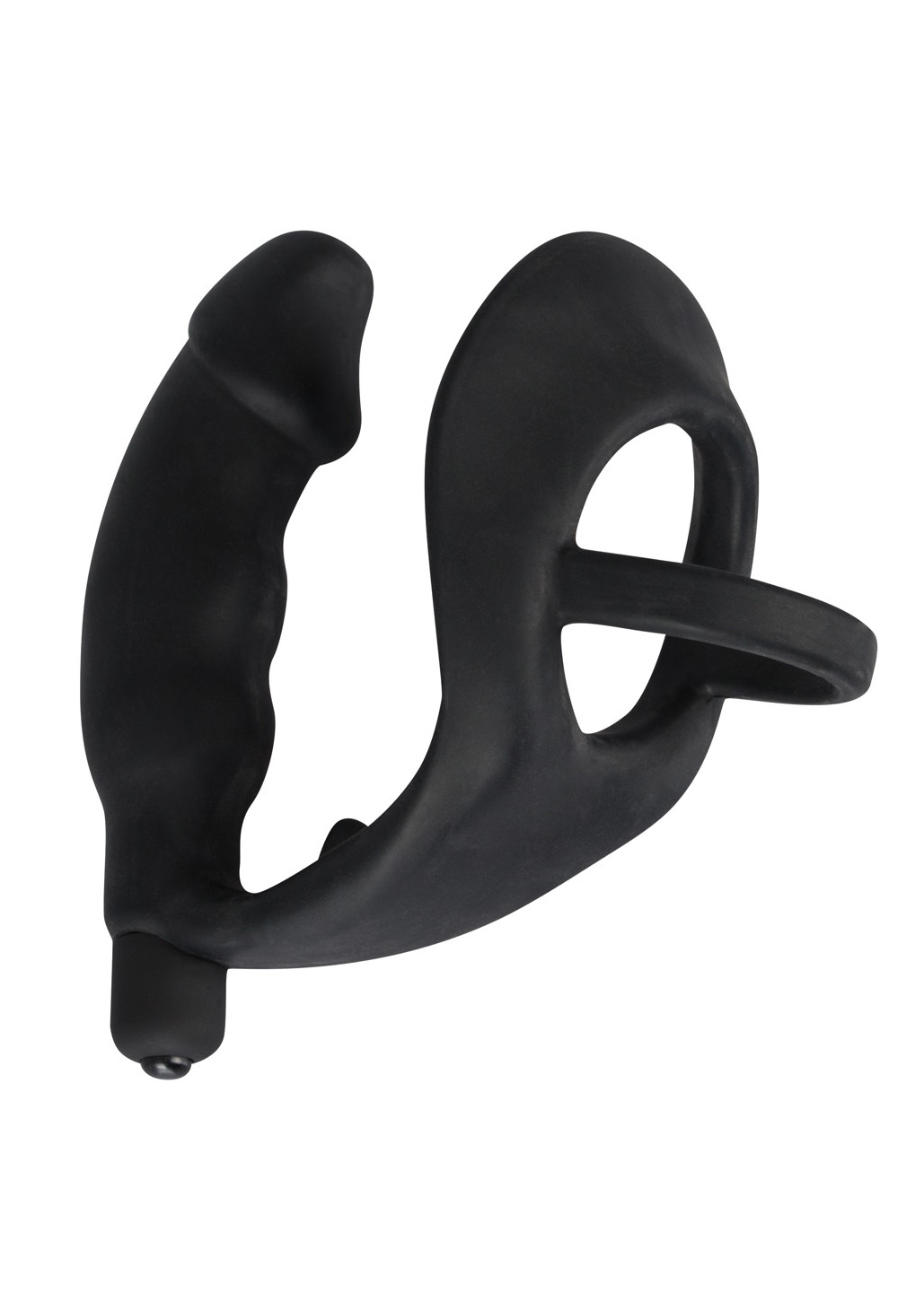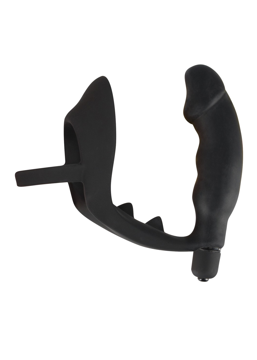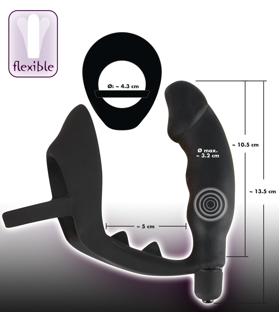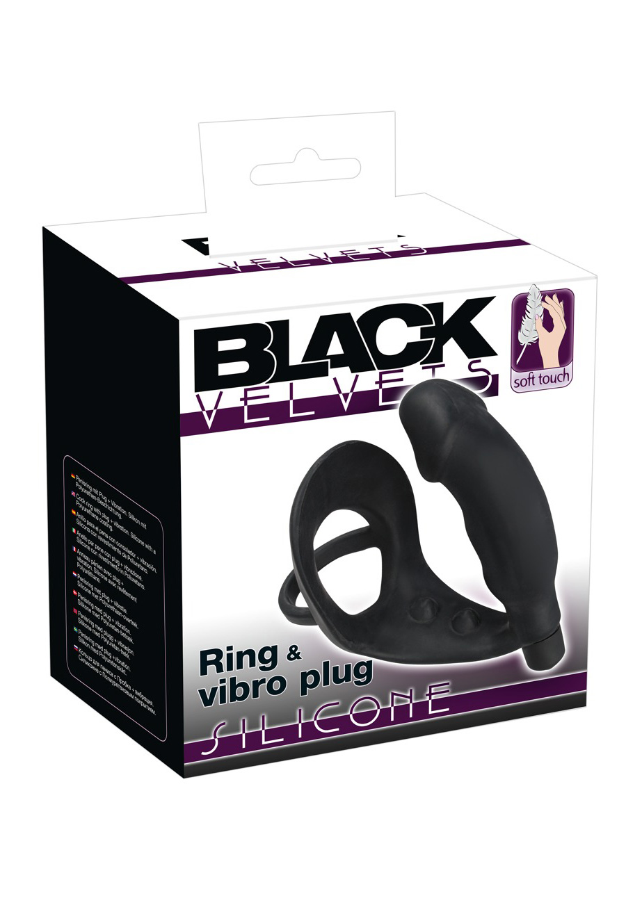 Czarny pierścień wibracyjny z wtyczką. Całkowita długość 11,2 cm, długość wtyczki 10,3 cm, długość pręta krocza 5 cm, Ø pierścienia 4,3 cm, Ø wtyczki 3,3 cm. Materiał: silikon, bez ftalanów zgodnie z Rozporządzeniem UE REACH.