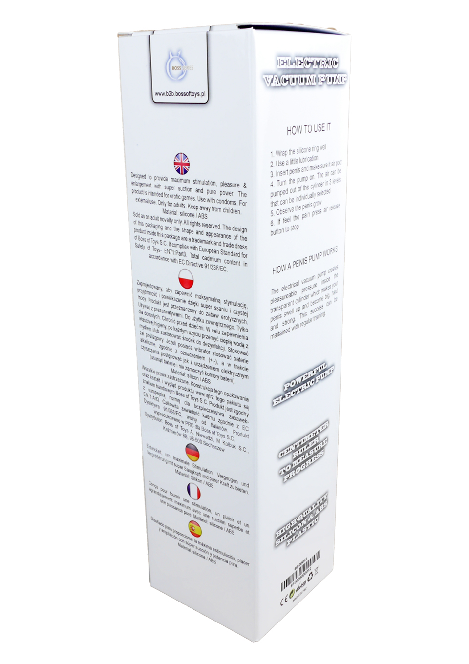 Elektryczna pompa próżniowa przeznaczona dla mężczyzn, którzy szukają nowych możliwości. Regularne stosowanie powoduje wzrost rozmiarów członka i wzmocnienie erekcji. Wysoka jakość materiałów użytych do produkcji pompy sprawi, że zastosowanie produktu będzie przyjemne, bezpieczne i długotrwałe. Urządzenie jest wyposażone w wydajną pompę.