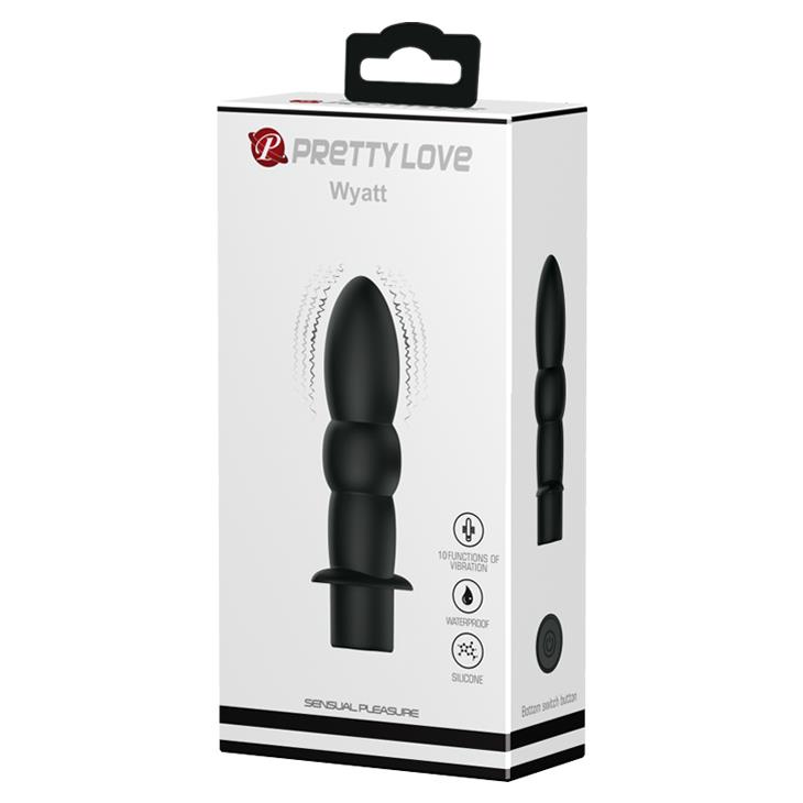 Wibrator Wyatt ma czarny odcień, który idealnie łączy się z jego wdzięcznymi krzywiznami. Model jest interesujący, ponieważ można go używać zarówno do penetracji pochwy, jak i odbytu. Falisty profil rękawa zwiększa intensywność wrażeń podczas wkładania i późniejszych tarć. Ponadto urządzenie jest bardzo skuteczne w precyzyjnym oddziaływaniu na strefy erogenne – zaostrzona końcówka pozwala na dokładne skupienie drgań na danym obszarze. Zaokrąglona głowa stopniowo zwęża się ku dołowi, a środek tułowia ma kształt kuli ograniczonej dwoma rowkami. U dołu miernik głębokości w postaci małych „skrzydełek”.