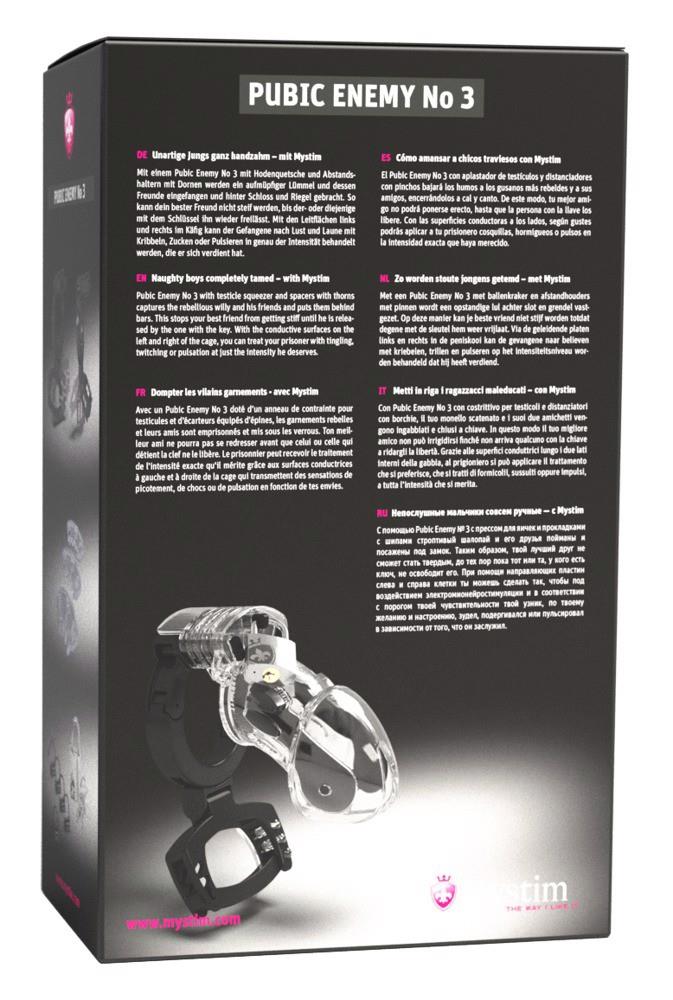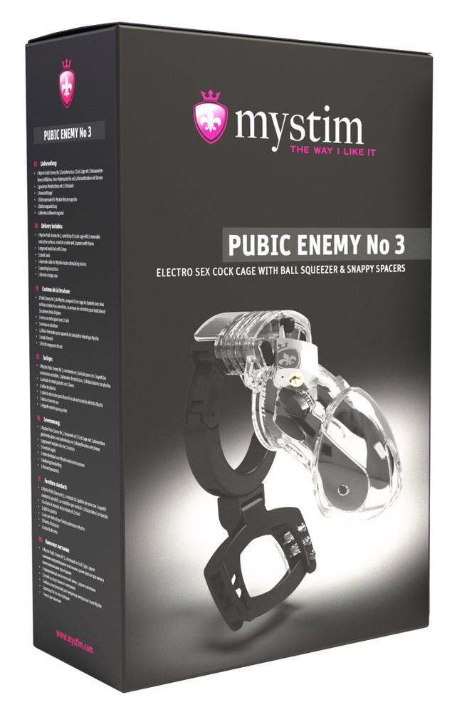 Klatka na penisa z funkcją e-stimu Pubic Enemy No 3 marki Mystim. Zmienna wielkość. Tłumi erekcję. Zapewnia różnorodne elektrostymulacje. Z 2 wymiennymi powierzchniami przewodzącymi wykonanymi z medycznego platynowego silikonu. W zestawie znajdują się 3 rozpórki, ściskacz jąder i metalowy zamek z kluczykiem, a także 5 plastikowych uszczelek, kabel elektrodowy i 10 znaczników posiadania. W walizce do przechowywania.