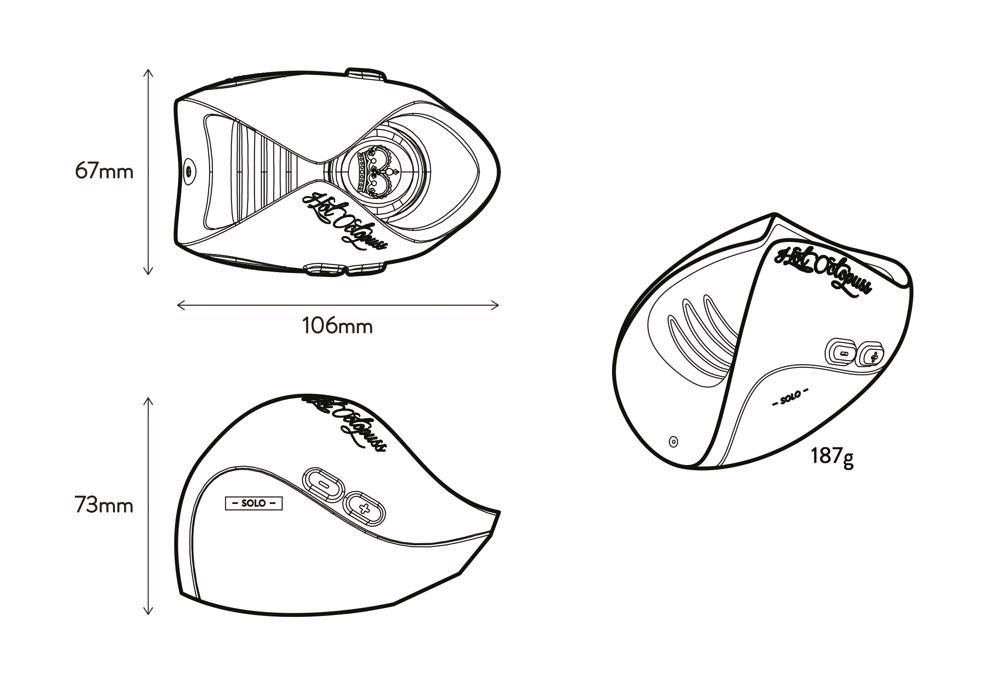 Długość całkowita 10,6 cm, szerokość 6,7 cm, wysokość 7,3 cm. ABS, silikon.