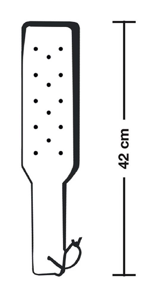 Fioletowo-czarna łopatka, która zbudowana jest z kilku warstw. Jedna strona lekko wyściełana, krawędź szyta. Rękojeść owinięta jest zamszem i sznurowana. 42 x 5 cm (w najszerszym miejscu).