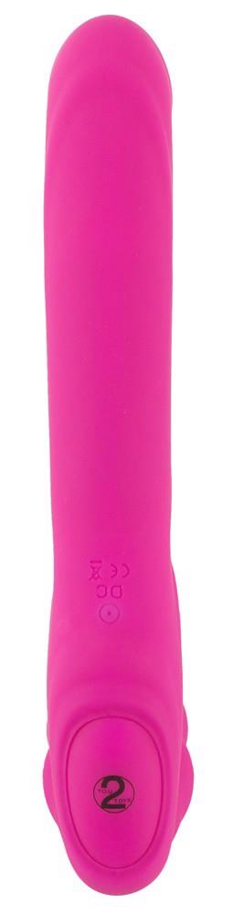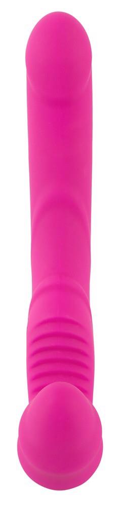 Strapless strap-on with a flexible double vibrator. The short, pronounced, wavy vibrator gets inserted into the vagina and then held by the vaginal muscles. Now the partner can be pleasured by the longer vibrator with a stimulating texture. The 9 different vibration modes can be adjusted with the button on the remote control (range 5 m). The double vibrator is covered in a soft touch texture which feels great against the skin during play and wear. Rechargeable – includes a USB cable and a battery (CR2032) for the remote control.