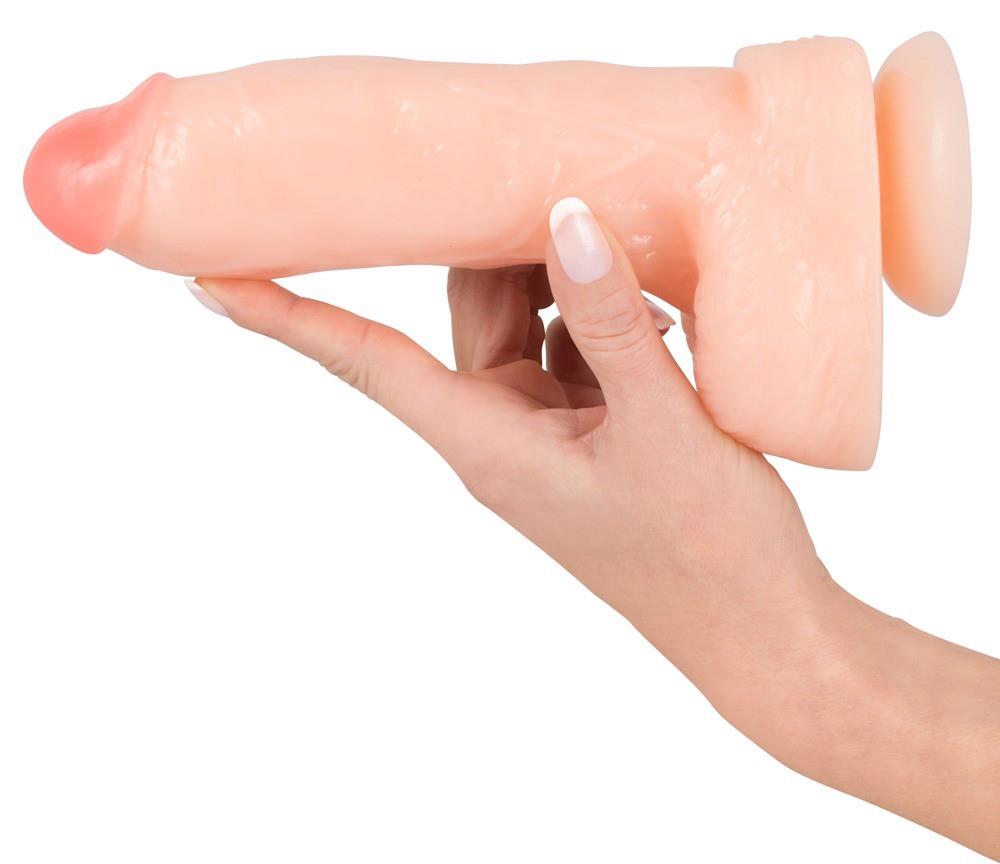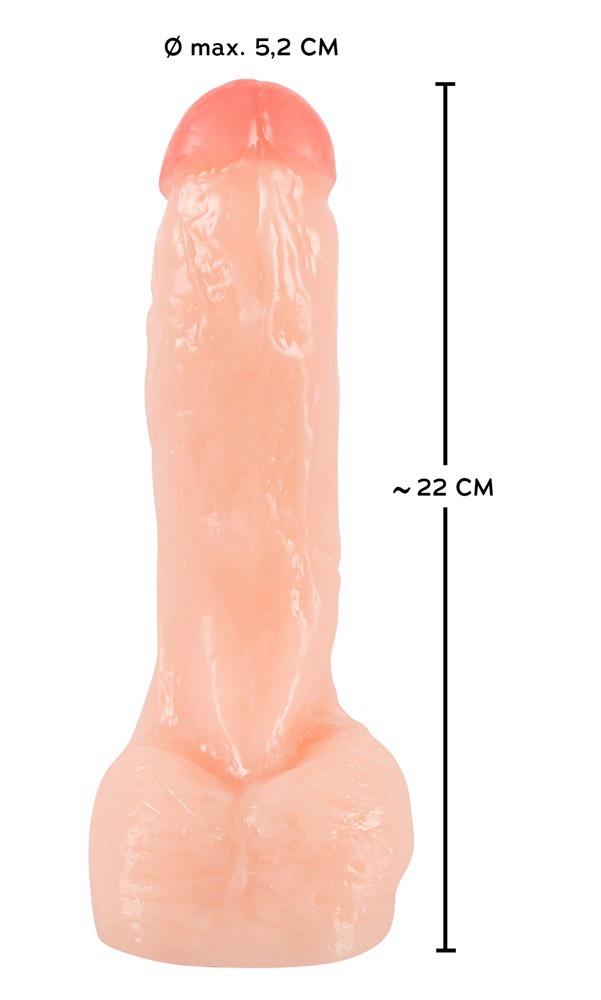 Realistyczne dildo w kształcie penisa z pulchną różową żołędzią i wyraźnym żyłkowaniem na trzonie. Z przyssawką pod chwytnymi jądrami. Postawny, wymiary wypełnienia: długość całkowita 22 cm, średnica 5,2 cm. PVC.
