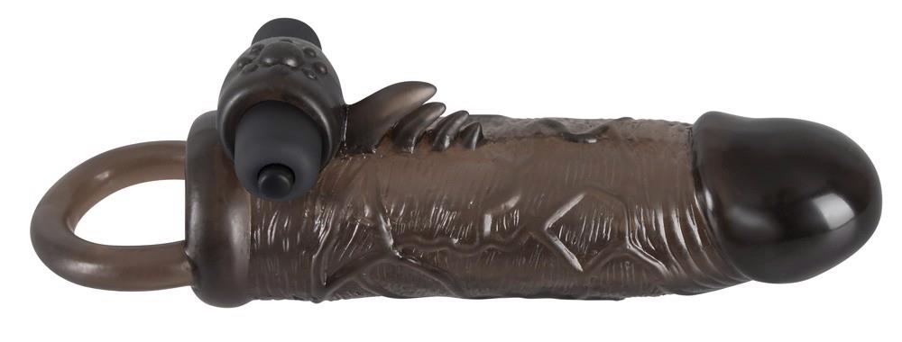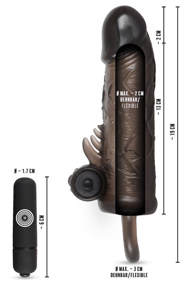 Ta osłona penisa inspiruje pierścieniem jąder i wibracyjną kulą. Pokrywa, która jest bardzo elastyczna jak pierścień i wyposażona w wybrzuszające się żołądź i wyraźne żyłki, psuje się z 4 małymi zębami stymulującymi i wkładką nubbingową do załączonej wibro-bulotki, która ma 10 różnych trybów.