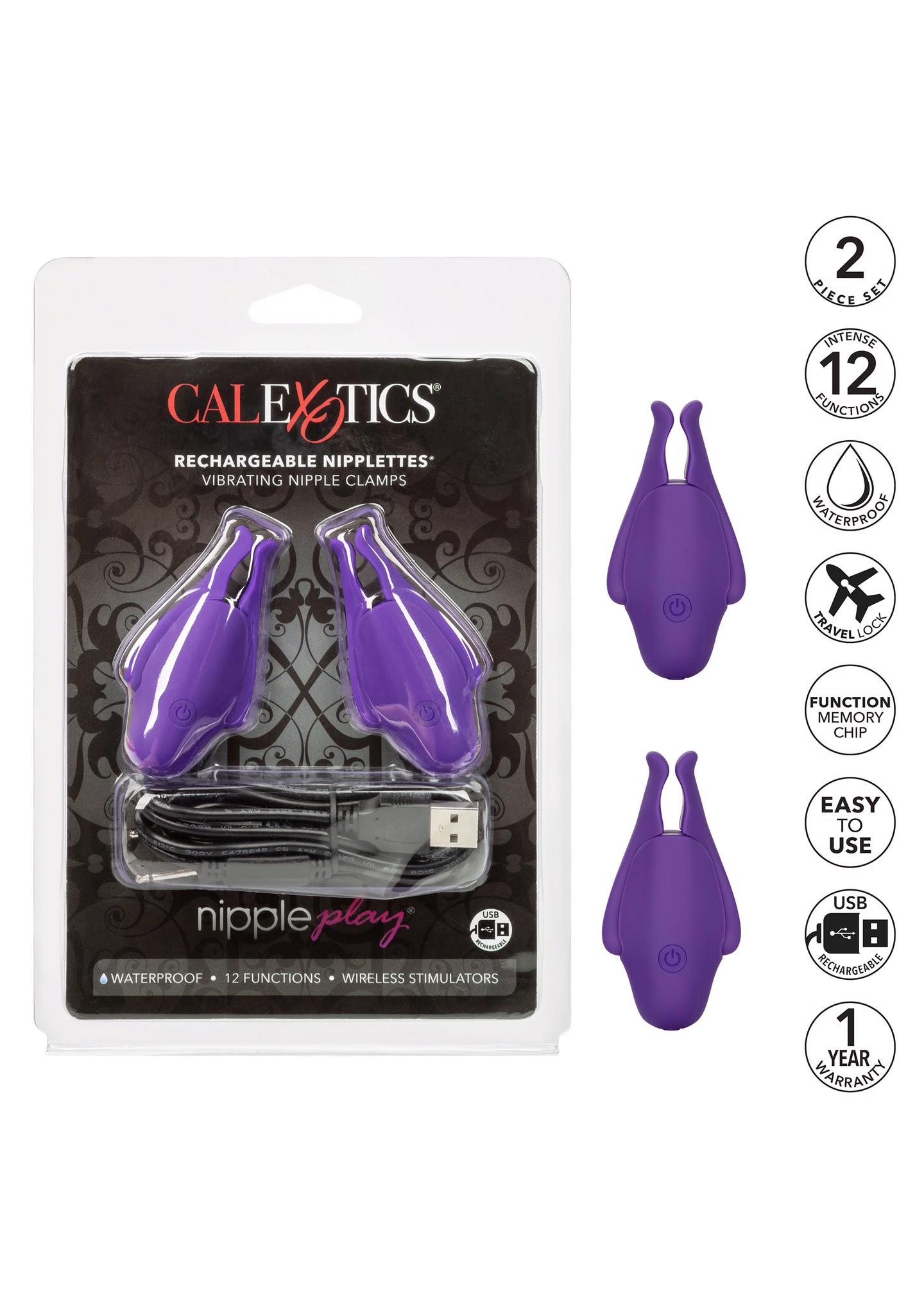 Blur the borders between pleasure and pain even further with the game-changing Nipple Play Rechargeable Nipplettes. This daring designer nipple clamp set features 12 independently controlled functions of vibration, fully adjustable clamps and USB rechargeable battery. Clamp these multi-use teasers to your body and enjoy every rush of stimulation as you flicker through the powerful functions of vibration at the touch of a button. As the tension tightens, the tingles intensify with every touch of the button for the ultimate in nipple stimulation toys. While the tickling vibrations tease the senses, the fully adjustable clamps let you control the thin line between pleasure and pain for a sinfully arousing experience. A single touch button controls up to 45 minutes of vibrating pleasure. Recharge your pleasure in only 1 hour with the dual charging USB cable into the self-sealing charging port. Take you pleasure to go with the travel lock feature, simply hold the power button for 3 seconds to turn on/off.