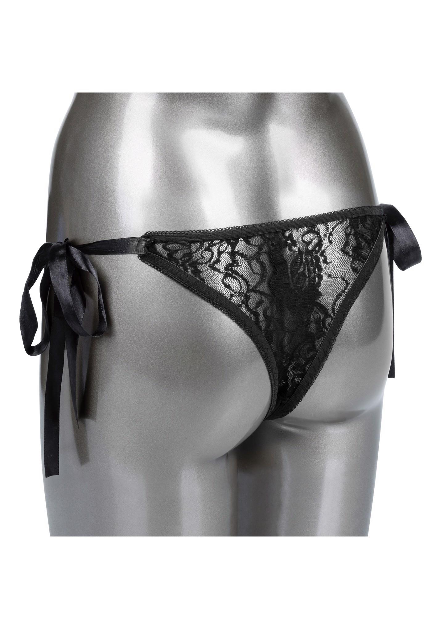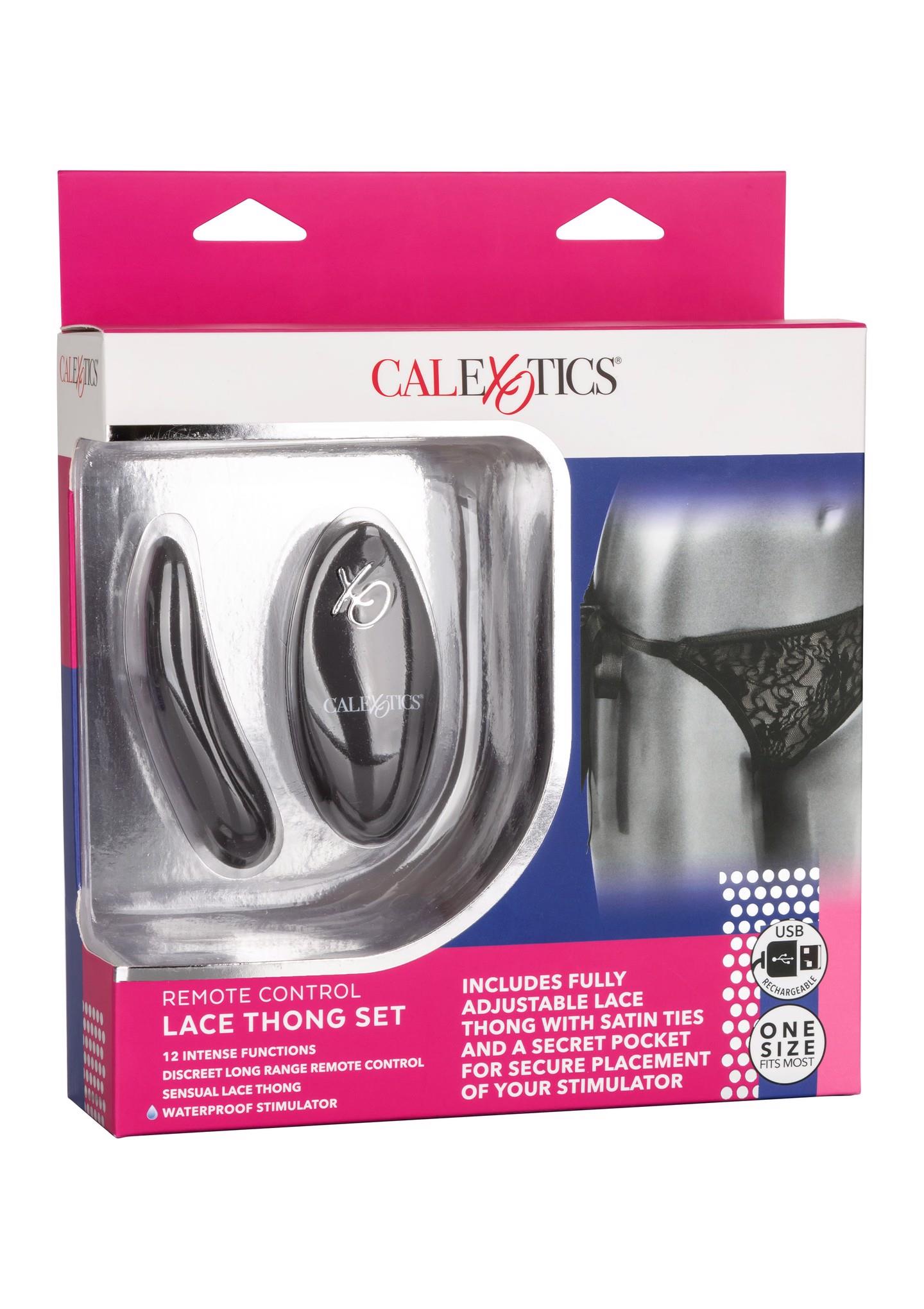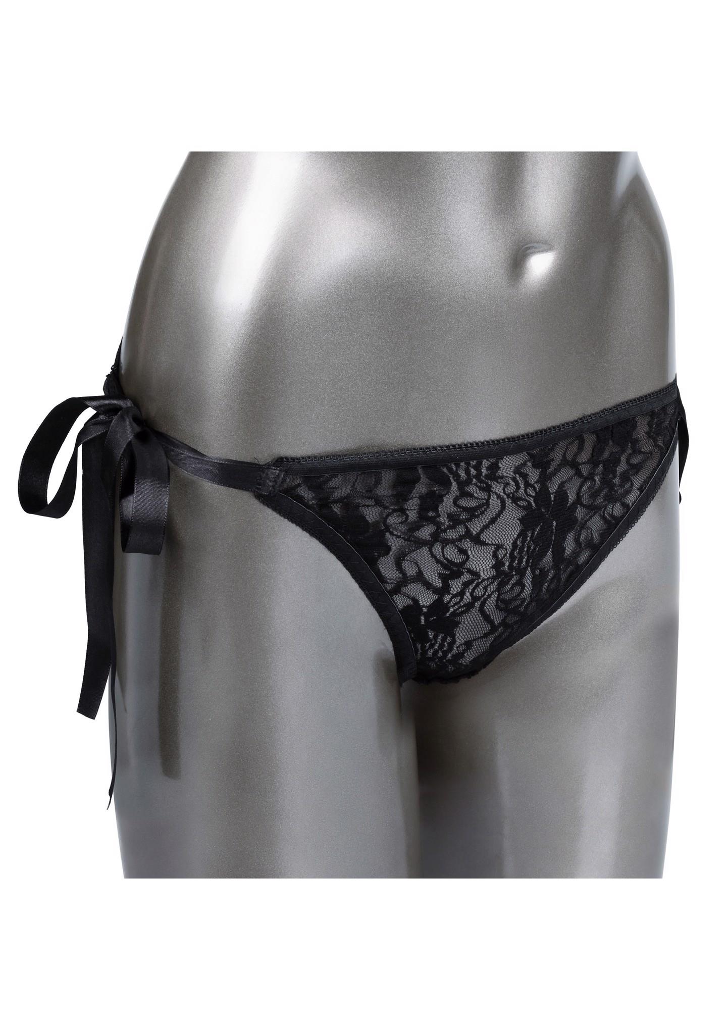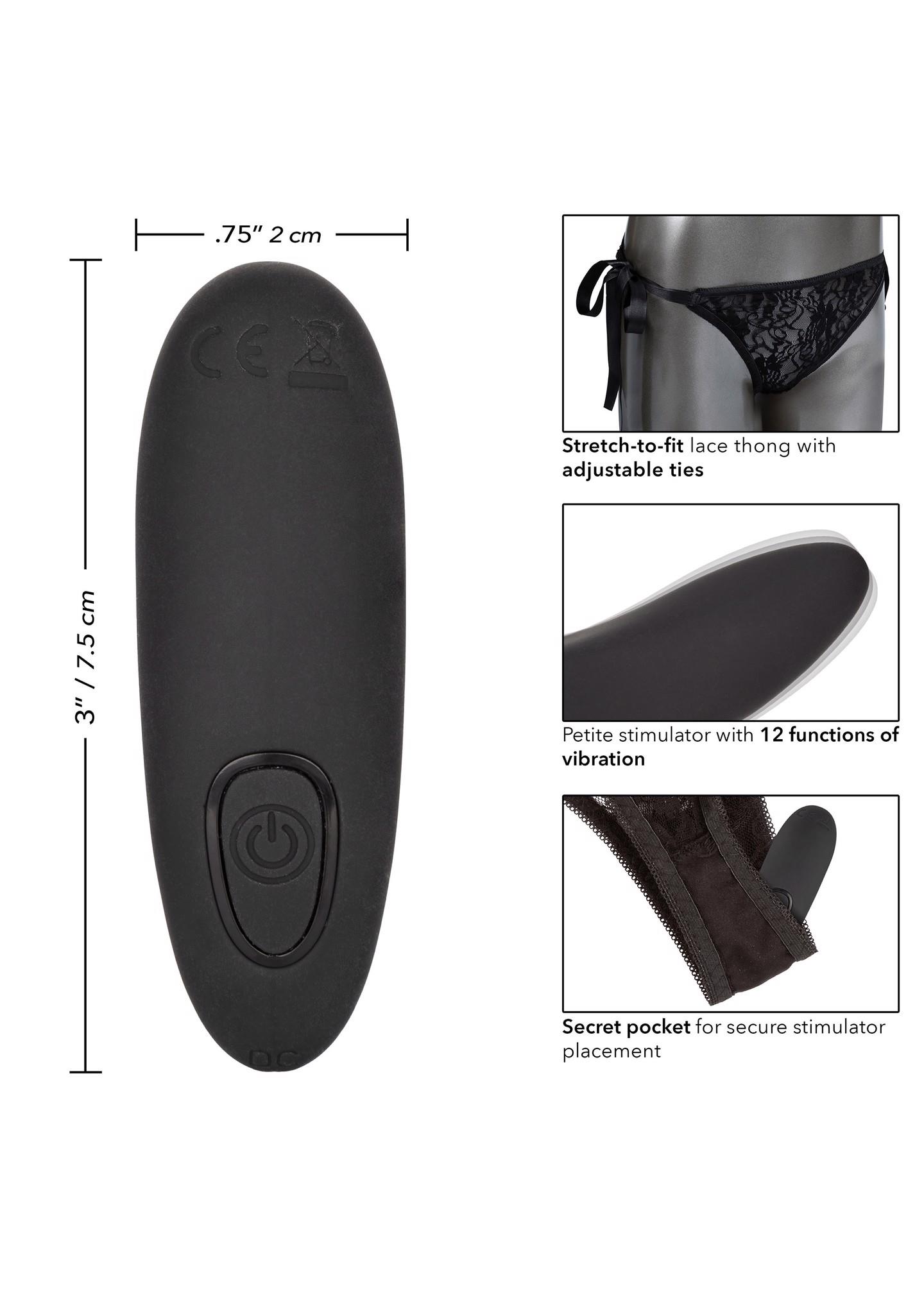 Indulge in your newest dirty little secret with the Remote Control Lace Set. This sexy set includes a stretch-to-fit tie-on lace thong, curved panty teaser and a discreet remote control with a range of up to 32’ (10 m). Whenever or wherever passion takes you, this passionate mini vibrator’s 12 intense functions of vibration are ready for playtime. The sexy and stretchy lace panties feature a satin side ties discreet internal pocket for the perfect stimulator pocket. Machine washable and oh-so comfortable, these vibrating panties are made from extended wear and adventurous playtime comfortable.Whether you choose to stay in control or you have left pleasure in your partner’s hand, this powerful teaser is sure to deliver knee-shaking sensation. From blushing beginners to erotic experts, this playful set adds versatile vibrations to any toy box. Recharge your passion in only 1 hour with the provided USB cable for up to 45 minutes of low-speed vibration or 40 minutes of high-intensity stimulation.