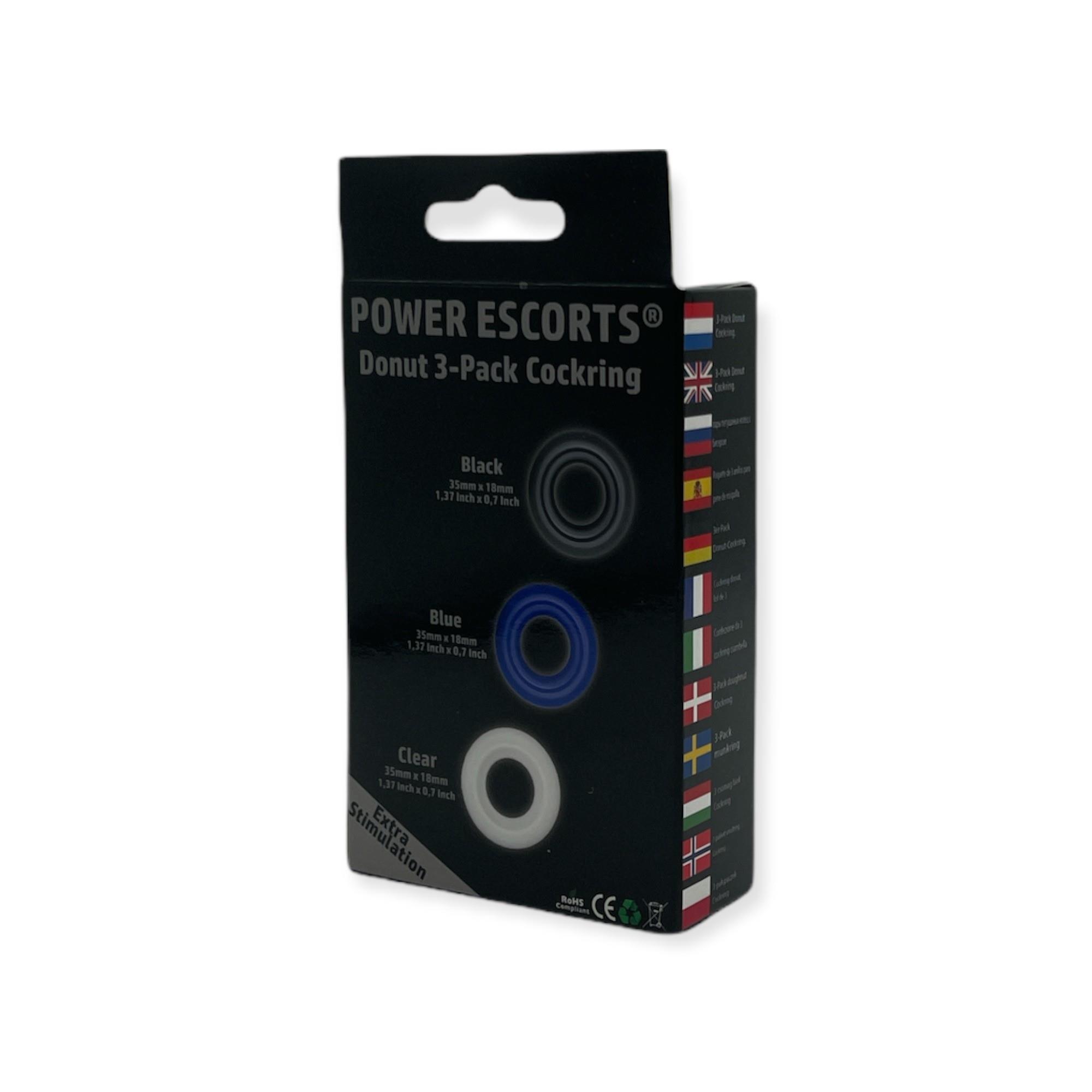 Power Escorts – BR272 – Donut Cockring 3 Pack – Super rozciągliwy – 3 kolory niebieski / przezroczysty / czarny – atrakcyjne kolorowe pudełko
