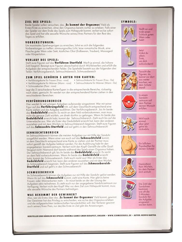 Ta uwodzicielska gra planszowa jest idealna dla wszystkich nowych kochanków lub par, które chcą odkryć siebie na nowo. Zaczyna się od prostych, rozgrzewających zadań, które stają się coraz gorętsze wraz z postępem gry i ostatecznie kończą się aktem miłości. Rosnący popęd seksualny jest gwarantowany – ale uważaj: orgazm nie może być osiągnięty przez żadnego z graczy do końca gry! Jeśli jeden z graczy przychodzi za wcześnie, musi spełnić wszystkie seksualne pragnienia partnera.