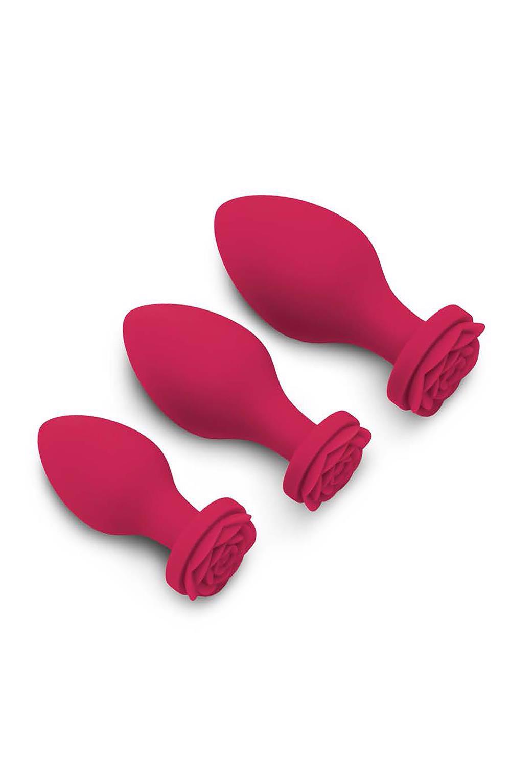 This 3-piece set is complete with three different sized plugs. Present a partner or yourself with a beautiful set of blooming rosebuds that are made to provide smooth, deep internal anal stimulation.Flat base and tapered tipGreat for beginnersSplashproofMade from hypoallergenic siliconePlug 1 LxW 3.5 x 1.5 inch / 8,9 x 3,8 cmPlug 1 Weight 0.19 lbs / 86 grPlug 2 LxW 3.25 x 1.25 inch / 8,2 x 3,1 cmPlug 2 Weight 0.14 lbs / 63 grPlug 3 LxW 2.75 x 1.125 inch / 6,9 x 2,8 cmPlug 3 Weight 0.11 lbs / 49 grWhat’s included3 plugsStorage bagInstruction Manual