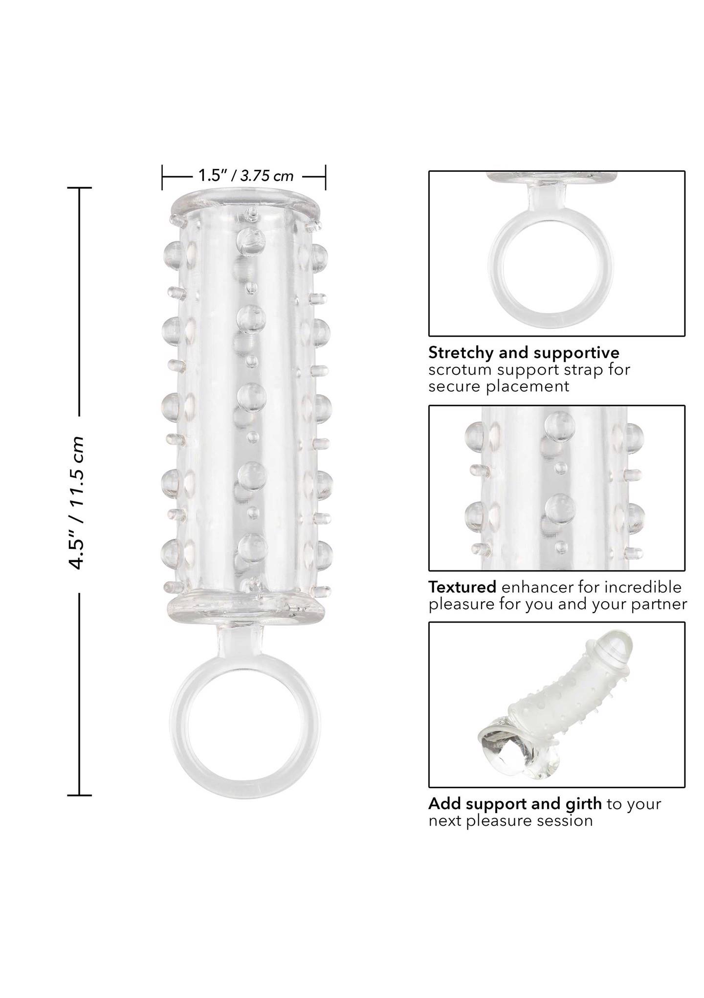 The Sensation Enhancer is a super tight, open-end extension sleeve with a sensually beaded shaft. The super sized enhancer wraps tight around your pleasure tool to increase girth, length and pleasure. While you thrill your lover with increased girth and stimulating beads, the fulfilling enhancer’s powerful erection support and open end design results in explosive results for both of you. The erotic enhancer sleeve’s ultra stretchy material and spacious chamber is made to fit even the biggest man. The textured chamber and built-in scrotum strap provide increase stimulation and powerful support. Wrap your pleasure tool in this super stretchy sleeve to easily increase stamina, stimulation and orgasmic pleasure. The flexible enhancer is made from a hygienically superior TPE. This body safe material is unscented and phthalate free to keep your most sensitive spots happy and healthy.