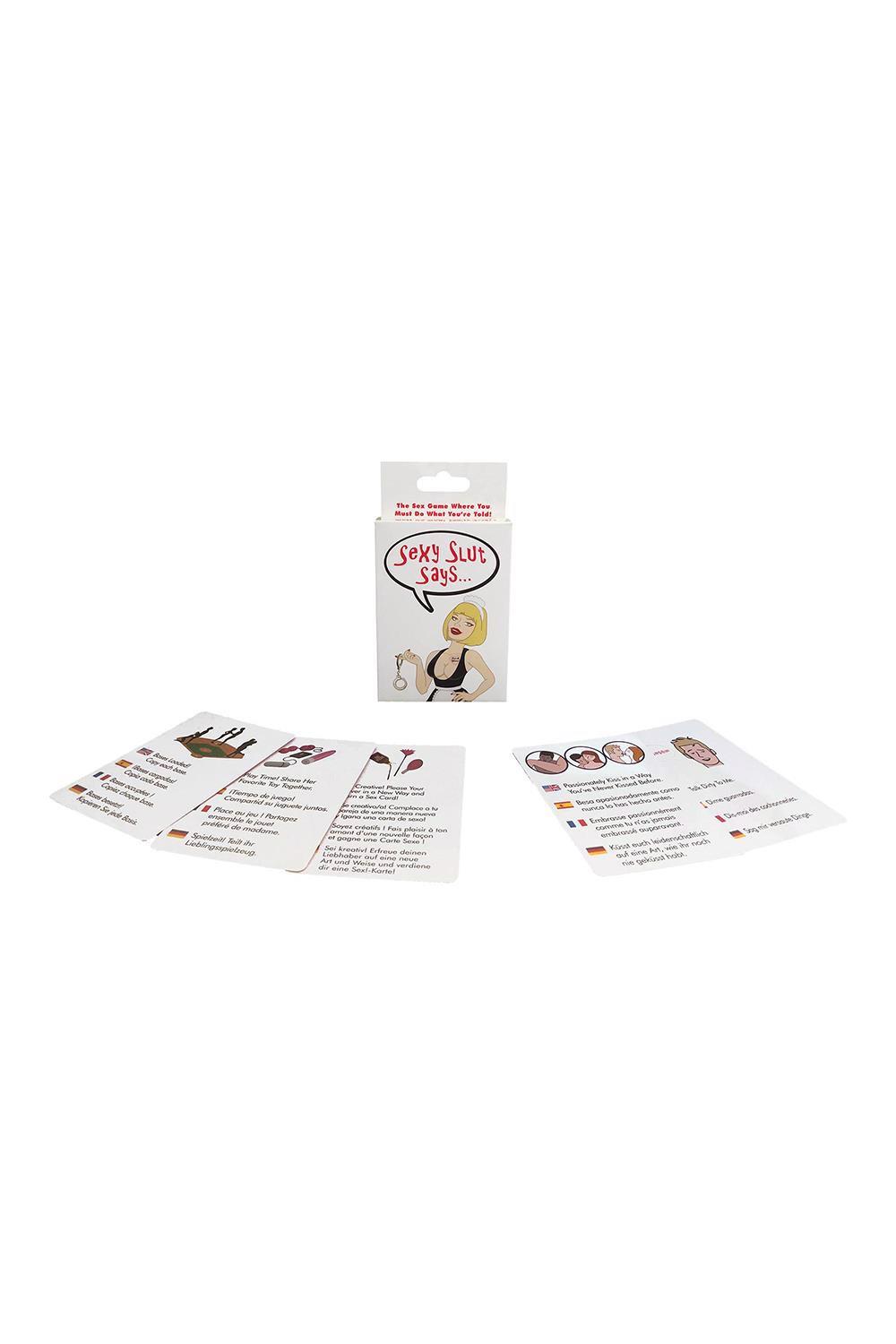 Sexy Slut Says is a year-round version of their highly successful Sexy Santa Says Game.Game play for Sexy Slut Says… is very simple. You separate the Sex! Cards from the Sexy SlutSays… cards. You and your lover take turns selecting and acting out Sexy Slut Says… cards.Some cards result in you earning a Sex! Card, and the first player to earn three Sex! cards wins,and gets to select a sex position on of these cards for the couple to act out.Sample Sexy Slut Says… Cards include “Don’t Thank Me, Just Spank Me.”, “Make an Obscene Gesture, Then Act It Out.”, and “Bases Loaded, Copy Each Base.” Original artwork is included on each card to demonstrate the action. For example, the “Based Loaded” card, shows a couple kissing on first base, fondling each other on second, and oral sex on third.Sample Sex! Cards include “Orgasmic Oral Sex for Her.”, “Full Blown Oral Sex for Him”, and“Easy Entry with Her Legs in a V-Shape”. These cards also include graphics to demonstrate how to do the sex positions.“The biggest compliments we receive about our games and at meetings and trade shows, is about our original and extensive game content.” explains CEO Brian Pellham. “The cards are all different with the exception of the five â€Be Creative! Please Your Lover in a New Way and Earn a Sex! Card!”. This is similar to all of the other sex card games in our line. We continue to give customers new things to try and that keeps them coming back for more ideas.”Sexy Slut Says…includes 4 languages English, Spanish, French and German.The sex game where you must do what you’re told! Carry out sex actions on the cards with your lover. Earn 3 Sex! Cards first, and you’re the winning slut who controls what you both act out. Includes 52 cards and game rules.