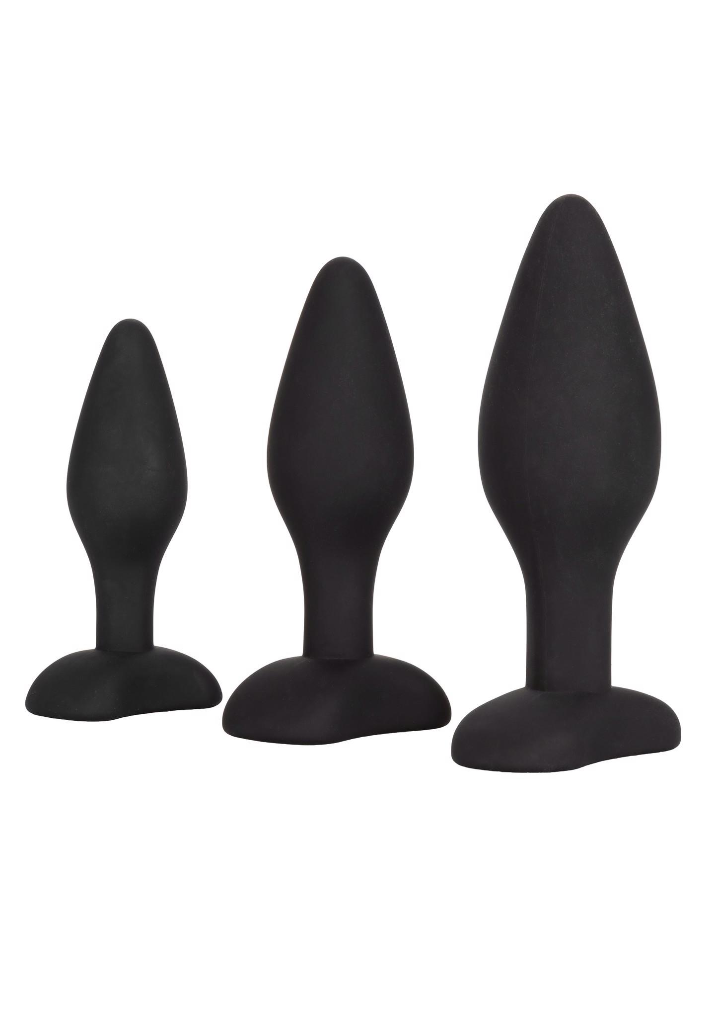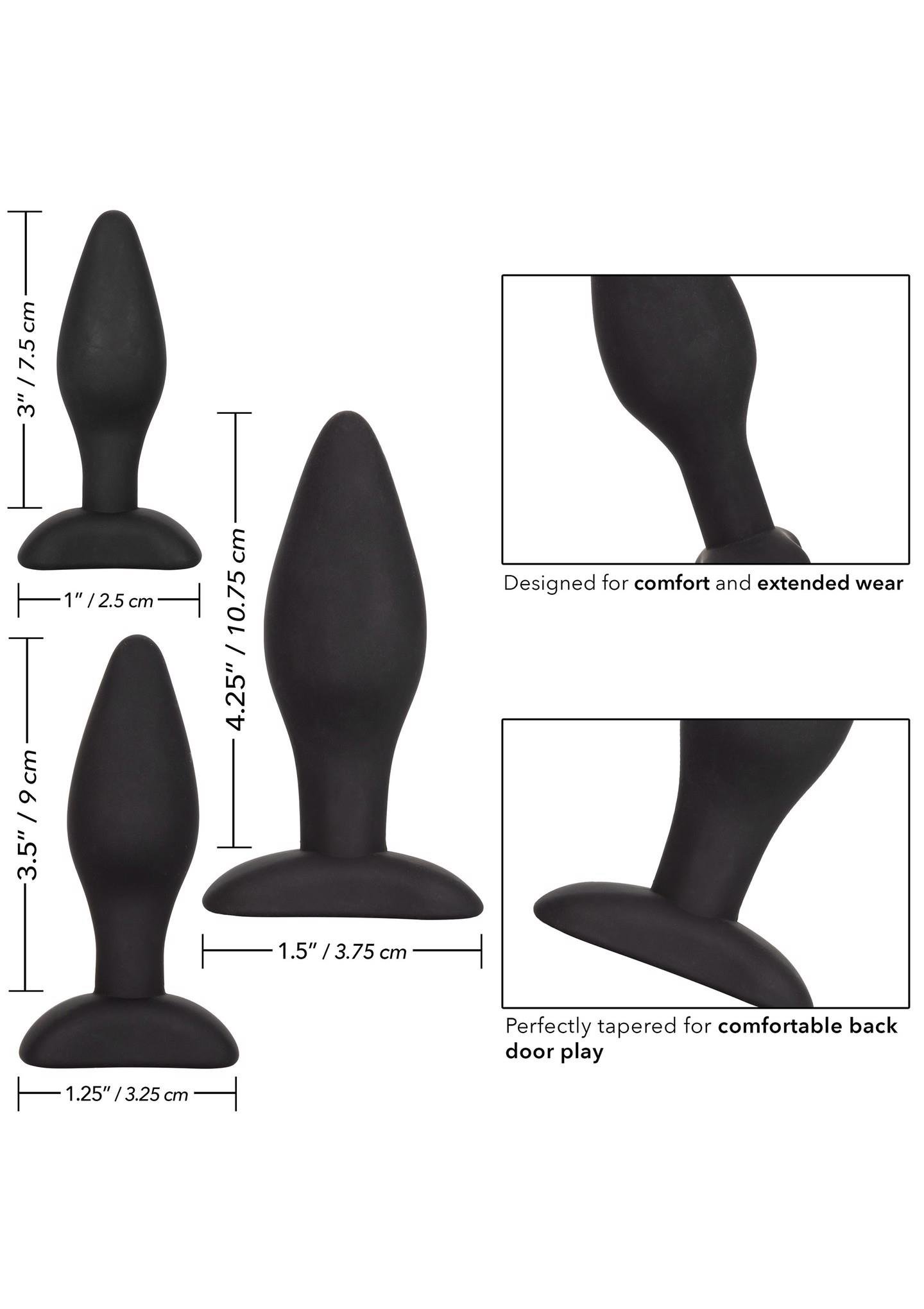 Open the door of thrilling anal sensation with the Silicone Anal Exerciser Kit. This kinky kit includes a set of 3 graduated anal plugs let you safely and comfortably increase passionate anal stimulation. To enjoy everything the exhilarating world of anal play has to offer, training is in order to ensure total safety and satisfaction. Each probe in our kit gradually increases in length and girth for superb pleasure at any level of pleasure play.While each increase of your training expands your horizons, use the convenient flanged base for steamy stimulation, effortless insertion and gentle removal. The flexible probes are made from a smooth, seamless Satin Finish silicone. This body safe material is unscented and phthalate free to keep your most sensitive spots happy and healthy