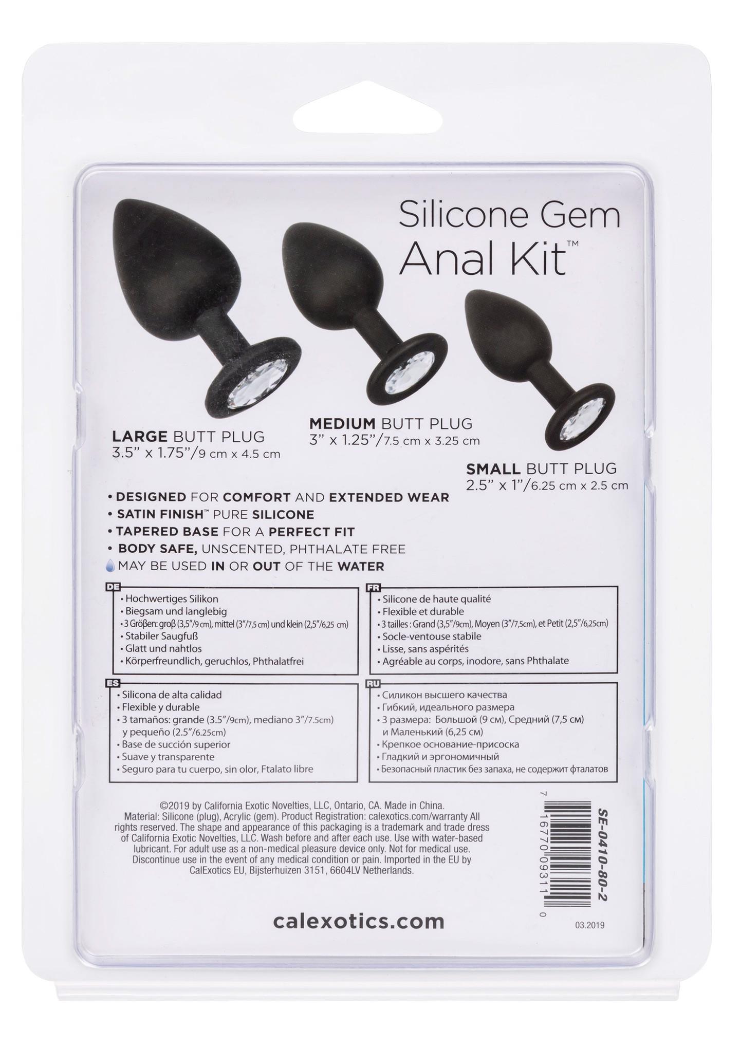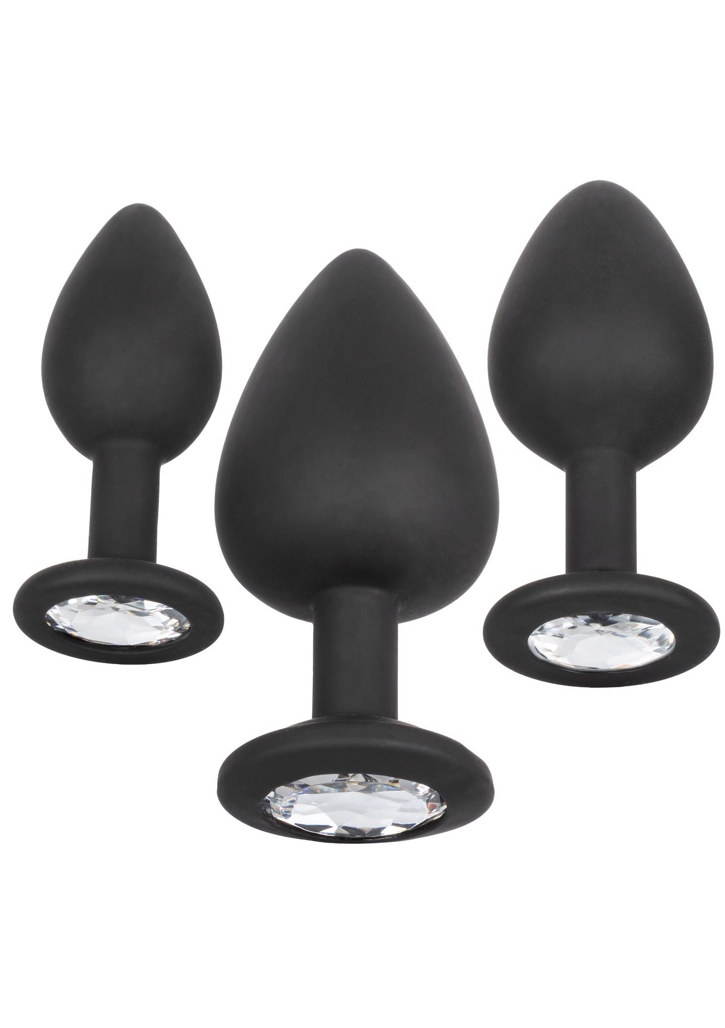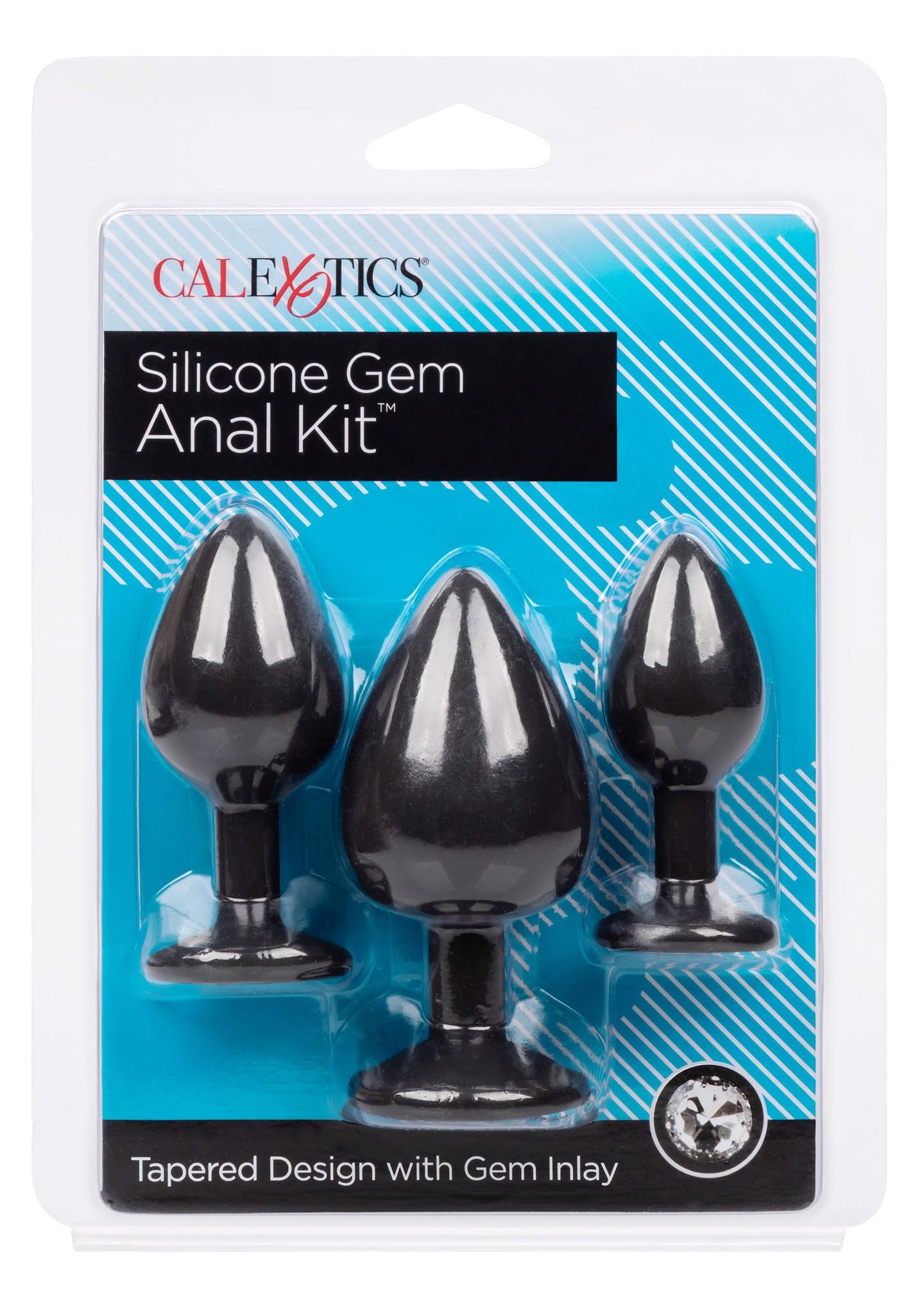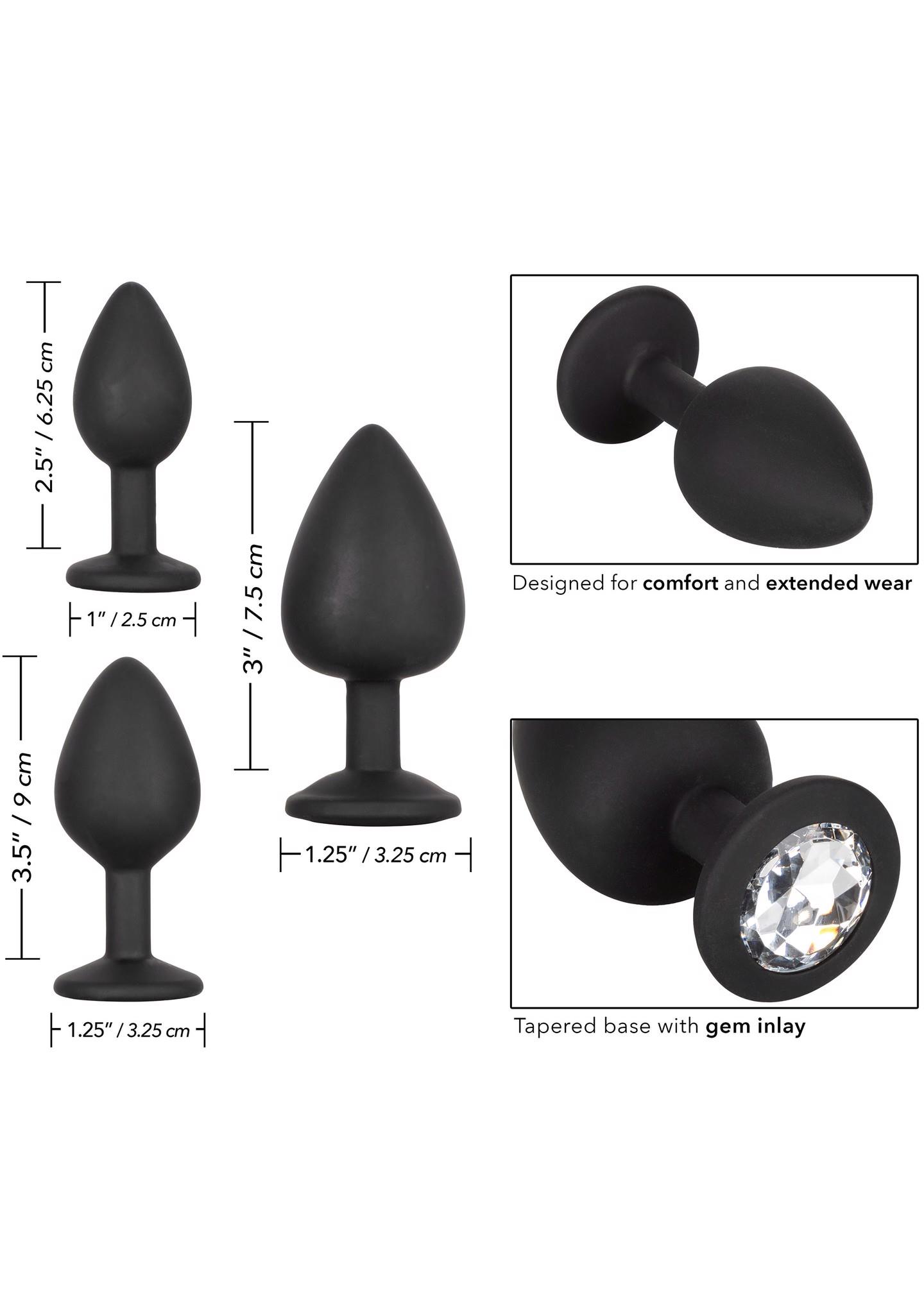 Open the door of thrilling anal sensation with the Silicone Gem Anal Exerciser Kit. This glamorous kit includes a set of 3 graduated anal plugs with a gem base to let you safely and comfortably increase passionate anal stimulation. To enjoy everything the exhilarating world of anal play has to offer, training is in order to ensure total safety and satisfaction. Each probe in our kit gradually increases in length and girth for superb pleasure at any level of pleasure play.While each increase of your training expands your horizons, use the sparkling gem adorned base for steamy stimulation, effortless insertion and gentle removal. The flexible probes are made from a smooth, seamless Satin Finish silicone. This body safe material is unscented and phthalate free to keep your most sensitive spots happy and healthy