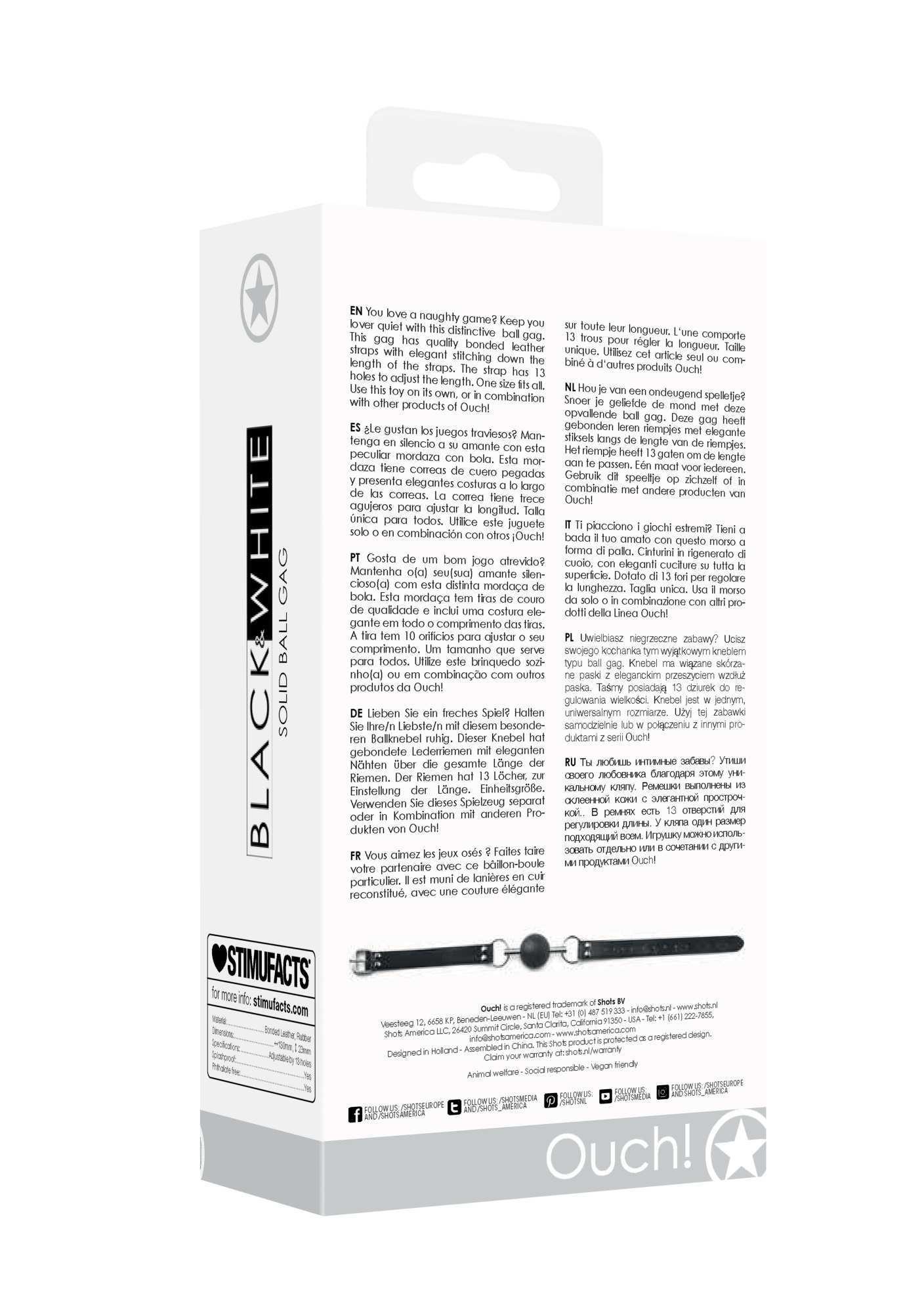 Uwielbiasz niegrzeczne zabawy? Ucisz swojego kochanka tym wyjątkowym kneblem typu ball gag. Knebel posiada wysokiej jakości skórzane taśmy z eleganckimi przeszyciami wzdłuż paska. Taśmy posiadają 5 dziurek do regulowania wielkości. Knebel jest w jednym, uniwersalnym rozmiarze. Użyj tej zabawki samodzielnie lub w połączeniu z innymi produktami z serii Ouch!