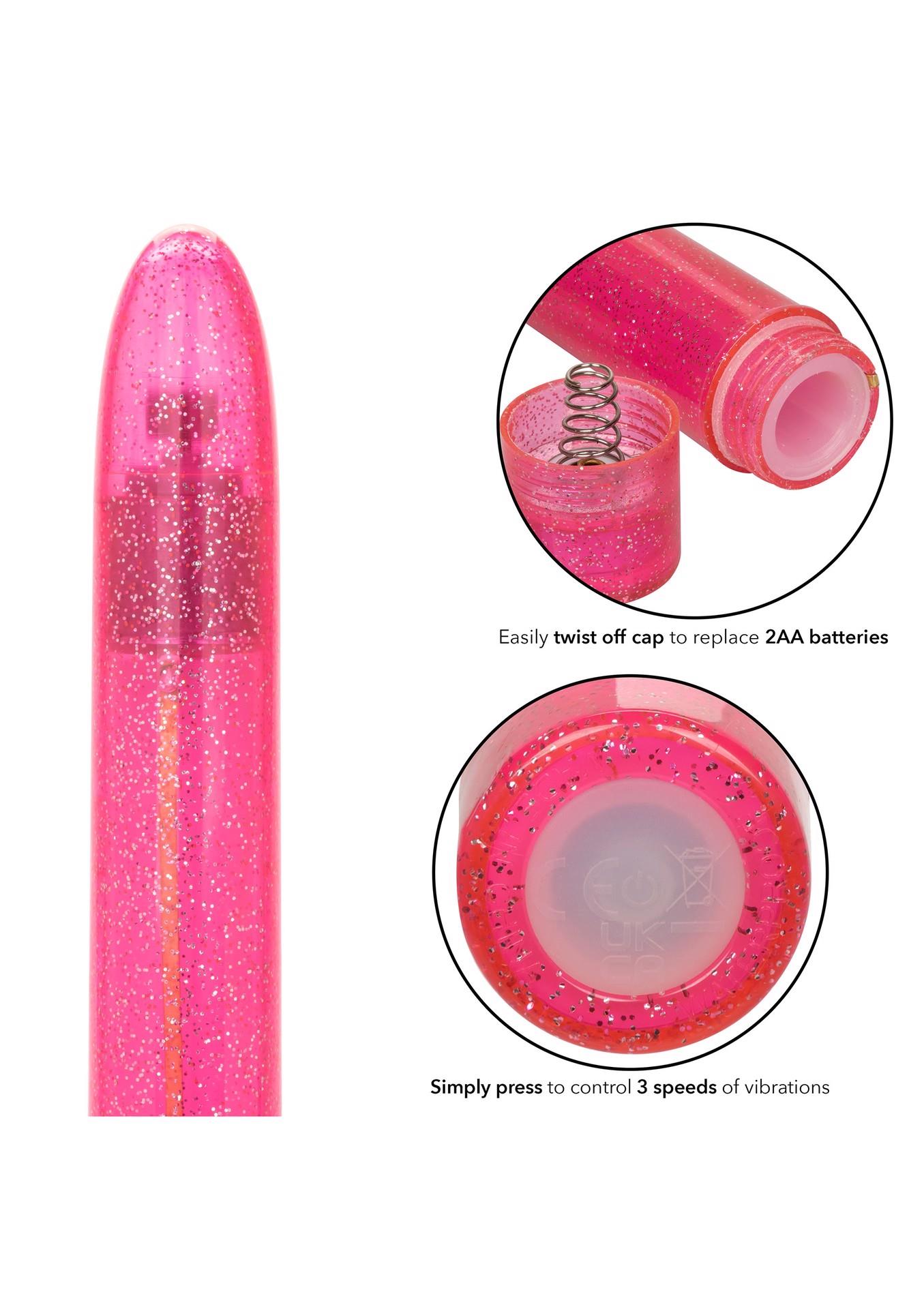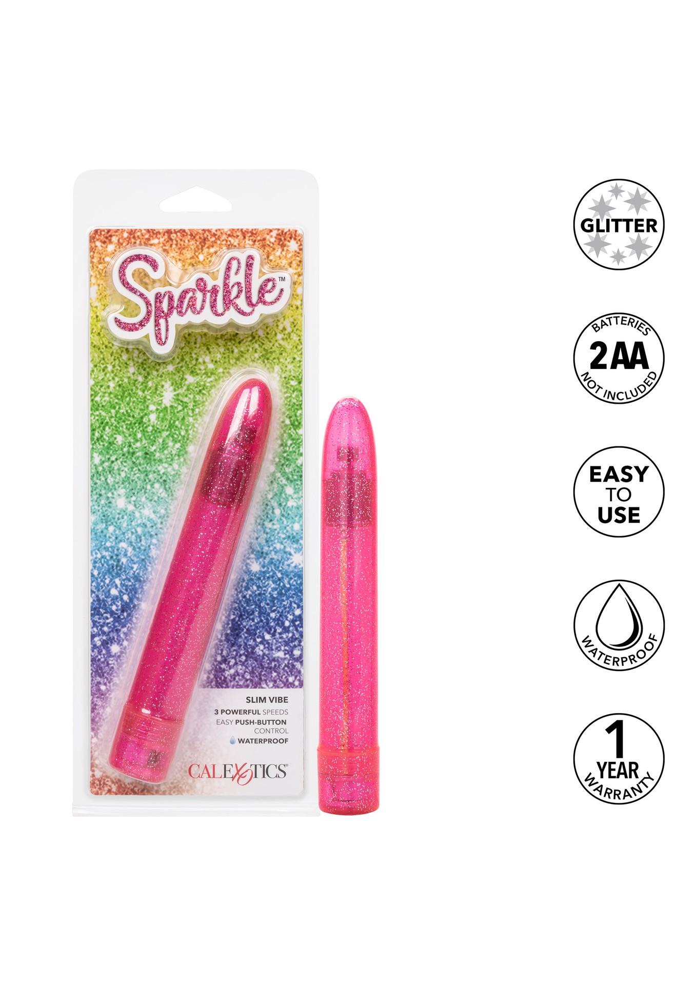 Indulge in dazzling pleasure with the Sparkle Slim Vibe, a sleek massager and 3 speeds of vibration. With an easy-to-use button and waterproof design, this is an erotic toy box must-have for beginners and erotic adventurers alike. This high-powered massager is created with a sleek, seamless body and gently curved tip to let you effortlessly control stimulation.