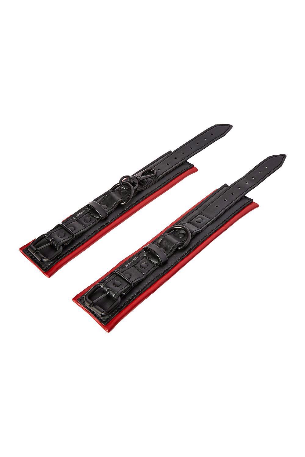 Bright scarlet on darkest midnight vegan leather creates an iconic cuff that will flavor many evenings of debauchery. These heavy-duty wrist restraints have soft inners for a comfortable seduction while you play with power, punishment, and pleasure. Link the cuffs together like a standard set of handcuffs, or separate them and combine with a spreader bar, chains, or other BDSM accessories. These restraints and durable and secure so that you know your plaything is fully captivated.Material: Vegan Leather