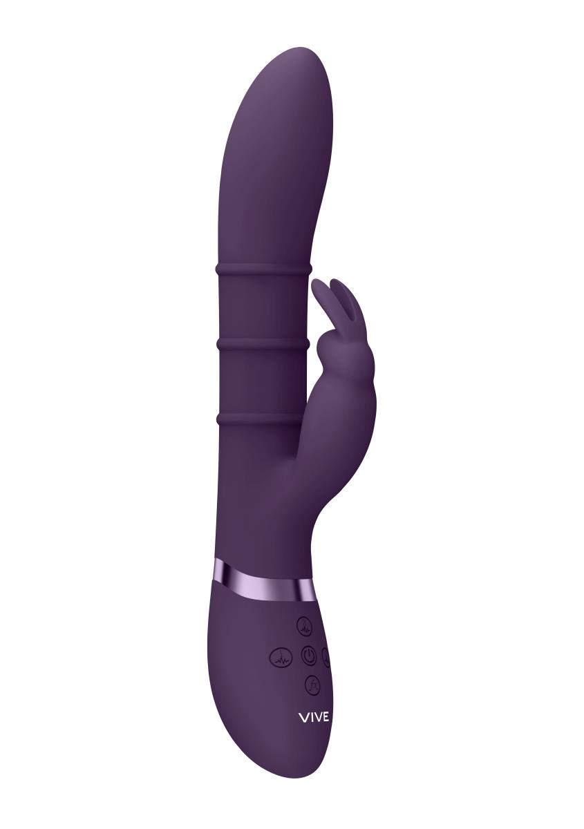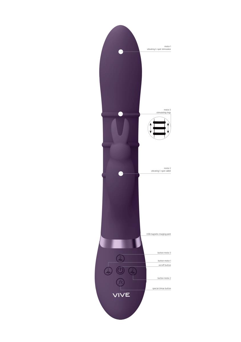 Dzięki ciągłym innowacjom marka VIVE High Class stała się synonimem pobudzenia, które nie ma sobie równych! Również ten służący do stymulacji punktu G wibrator-króliczek to towar z najwyższej półki. Wyjątkowe funkcje i ustawienia, w które wyposażono ten luksusowy gadżet, sprawią, że w ekstazie nawet palce u stóp będziesz wykręcać z rozkoszy! Trzon zabawki wykonano z gładkiego, medycznego silikonu, w który wbudowano komplet trzech stymulujących pierścieni. Przesuwając się w górę i w dół, pierścienie dostarczą ci niezrównanego ?wewnętrznego” masażu. Pierścienie mają 10 różnych ustawień prędkości, a jeśli chodzi o stymulator punktu G i stymulator-króliczek, to każdy z nich wyposażono w 10 różnych trybów wibracji. Łącznie daje to imponujący wynik aż 1000 niepowtarzalnych ustawień stymulacji do wyboru. VIVE054 jest na tyle wodoodporny, że można go swobodnie zanurzać w wodzie (klasa IPX7 wodoodporności). Po wyczerpaniu się wbudowanego akumulatora urządzenie można naładować ponownie. Pełny cykl ładowania baterii trwa 150 minut, co pozwala następnie na 45 minut nieprzerwanych namiętnych igraszek. Wibrator jest przy tym cichy: nawet na najwyższych obrotach urządzenie nie przekracza nigdy poziomu 60 decybeli. Ponadto tę wyjątkową, innowacyjną zabawkę wyposażono w blokadę podróżną oraz w specjalną funkcję szczytowania. Gdy czujesz zbliżający się orgazm, wystarczy jedno dotknięcie przycisku uruchamiającego funkcję szczytowania, żeby natychmiast przełączyć wszystkie silniczki na pełną moc i maksymalną prędkość.