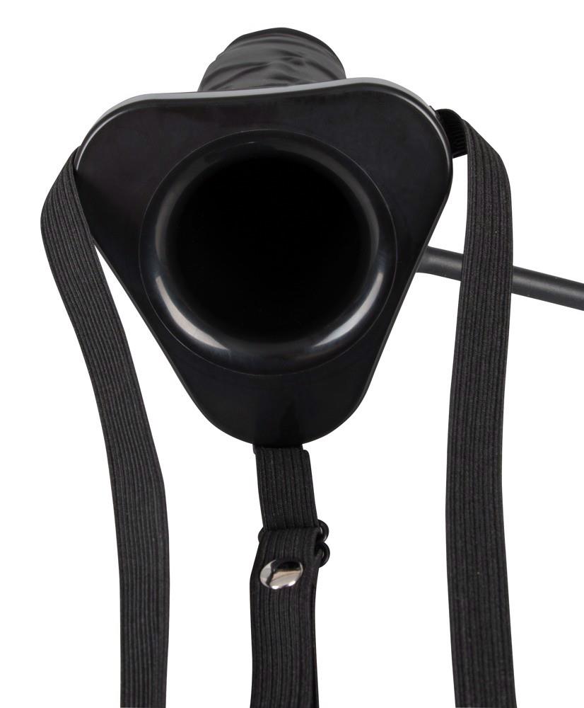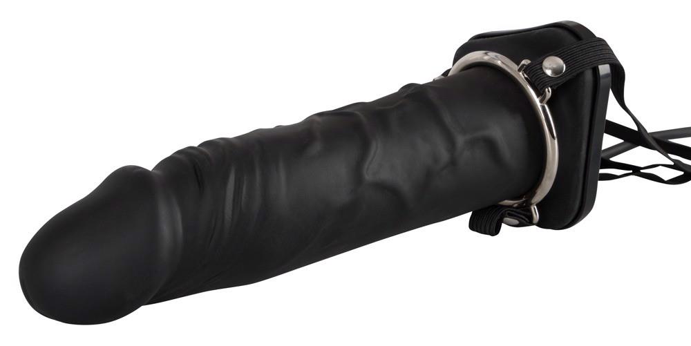 Nadmuchiwane, wewnątrz wydrążone i stabilne dildo z indywidualnie regulowanymi paskami. Czarny. Dildo 18,5 cm długości, wewnętrzna średnica 4,2 cm (nie rozciągliwa), zewnętrzna średnica nadmuchiwana do maks. 9 cm. Głębokość wsunięcia Dildo 17 cm. Z zaworem spustowym. Silikon, ABS, lateks, żelazo, poliamid.