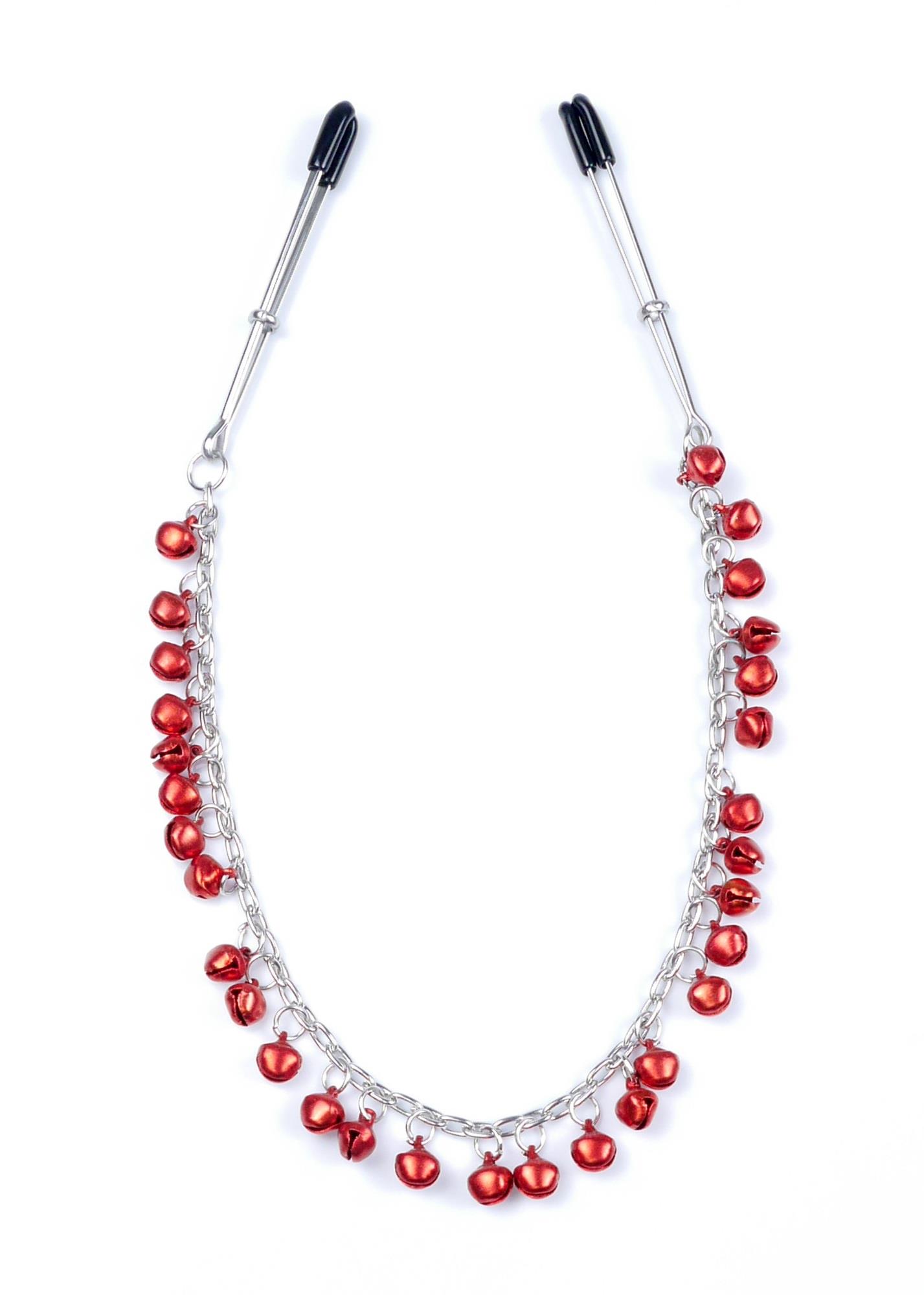 Wytrzymałe metalowe zaciski pokryte miękką gumą, te zaciski są idealne dla początkujących jak i entuzjastów. Ruchome pierścienie służą do regulacji intensywności nacisku klamry (od delikatnej do intensywnej). Elegancki łańcuszek z małymi dzwoneczkami łączy oba sutki, daje to niesamowitą stymulację przy każdym ruchu.