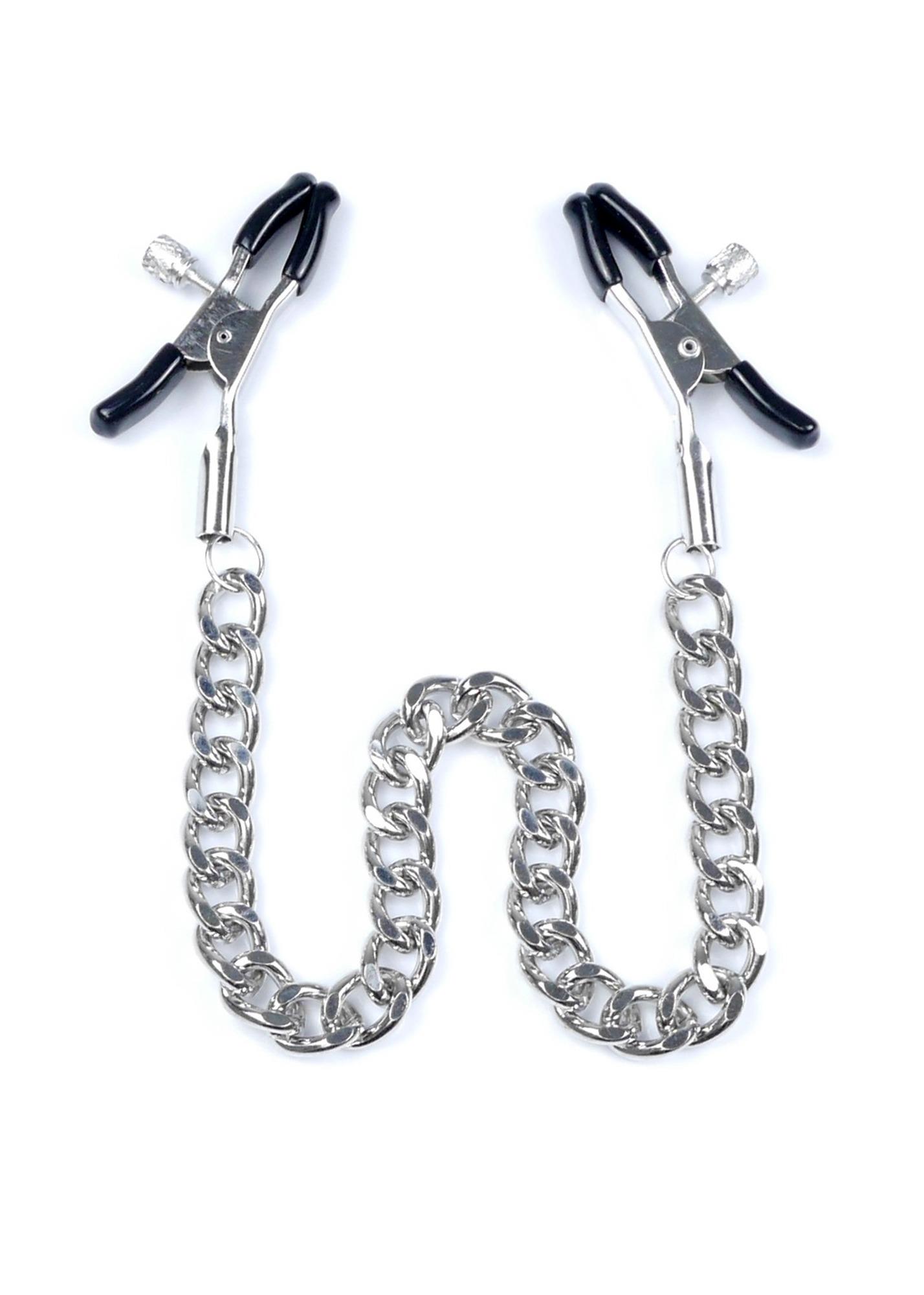 Wytrzymałe metalowe zaciski pokryte miękką gumą, te zaciski są idealne dla początkujących jak i entuzjastów. Siłę zacisku brodawki można regulować obracając śrubę, Elegancki łańcuszek łączy oba sutki, daje to niesamowitą stymulację przy każdym ruchu.