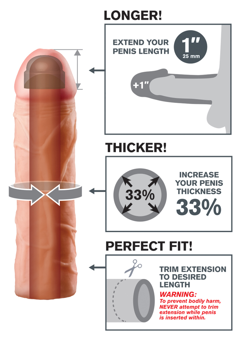 Zmień swojego penisa w maszynę do natychmiastowej przyjemności dzięki niesamowitym naprężeniom Fantasy X. Teraz możesz być takim, jakim możesz być i zadowolić swojego partnera dzięki temu łatwemu w użyciu wzmacniaczowi erekcji. Opracowany jako bezpieczna, przystępna cenowo, niechirurgiczna alternatywa dla drogich procedur medycznych i tabletek, Twój Fantasy X-tension zapewni Ci największą, najgrubszą i najbardziej satysfakcjonującą wędkę, jaką kiedykolwiek sobie wyobrażałeś! Idealny dla mężczyzn z problemami z zaburzeniami erekcji i w połowie drogi, Twój nowy wzmacniacz zapewni rezultaty, które pokochają oboje partnerzy! Rozszerzenie Perfect 2 ‘to konfigurowalne rozszerzenie, które można łatwo przyciąć u podstawy, aby uzyskać idealne dopasowanie. Jest bardzo rozciągliwy, aby pomieścić większość rozmiarów i wystarczająco dopasowany, aby pomóc Ci dłużej. Twój partner będzie cieszyć się głębszą penetracją dzięki przedłużeniu 2’ na czubku, podczas gdy ultrarealistyczny trzon sprawi, że będziesz grubszy o 33%. Miękki materiał Fanta Flesh jest jak druga skóra, zapewniając długość, obwód i pewność siebie, których potrzebujesz, aby zadowolić swojego kochanka. Jeden rozmiar pasuje do większości. To nie jest prezerwatywa.