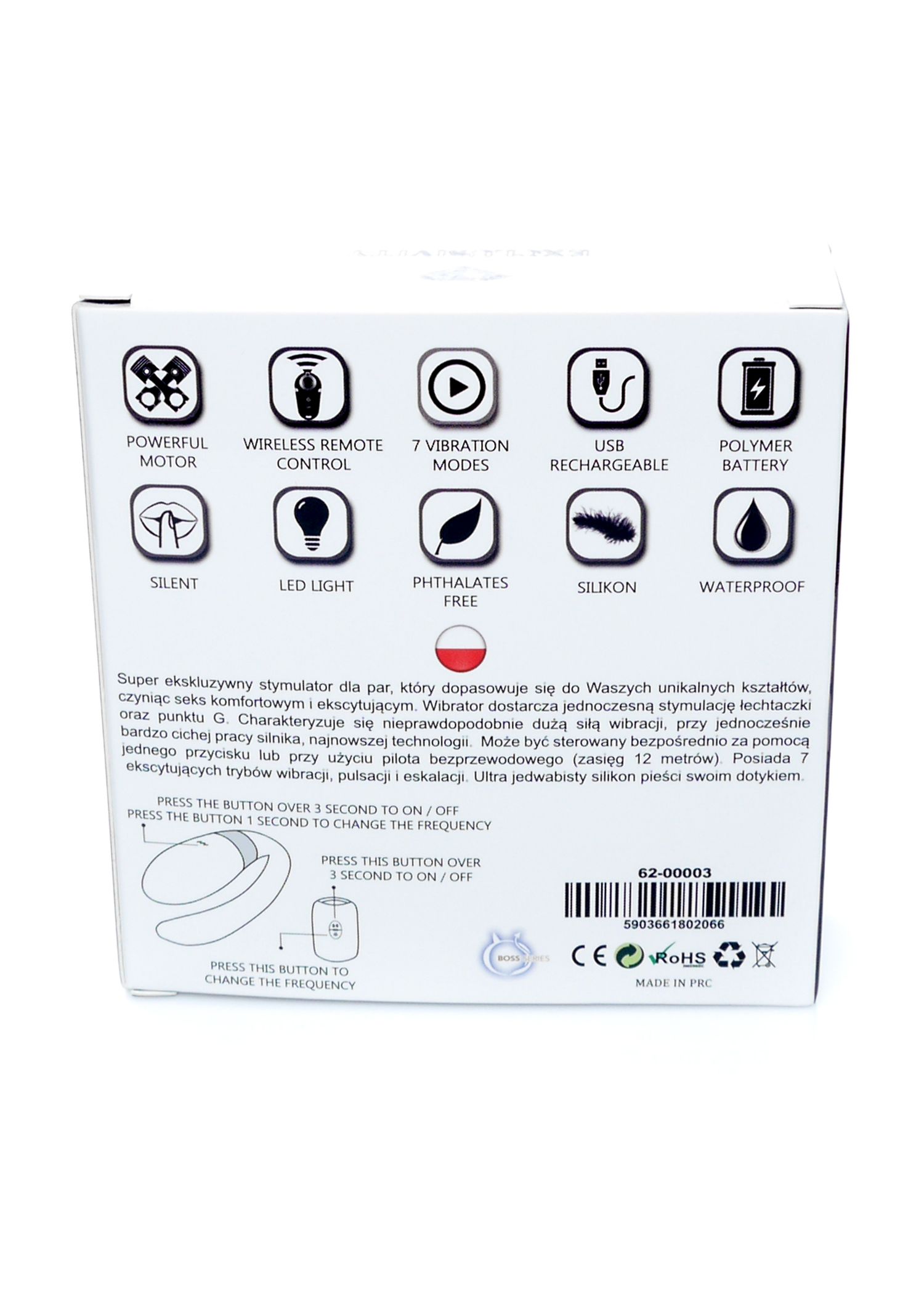 Charakteryzuje się nieprawdopodobnie dużą siłą wibracji, przy jednocześnie bardzo cichej pracy silnika, najnowszej technologii. Może być sterowany bezpośrednio za pomocą jednego przycisku lub przy użyciu pilota bezprzewodowego (zasięg 12 metrów). Posiada 7 ekscytujących trybów wibracji, pulsacji i eskalacji. Ultra jedwabisty silikon pieści swoim dotykiem. Ledowe podświetlanie, ładowany za pomocą kabla USB (w zestawie).