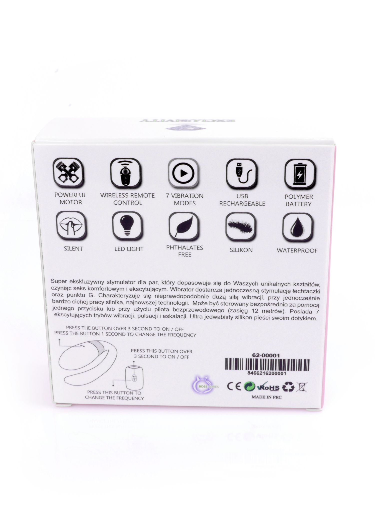 Charakteryzuje się nieprawdopodobnie dużą siłą wibracji, przy jednocześnie bardzo cichej pracy silnika, najnowszej technologii. Może być sterowany bezpośrednio za pomocą jednego przycisku lub przy użyciu pilota bezprzewodowego (zasięg 12 metrów). Posiada 7 ekscytujących trybów wibracji, pulsacji i eskalacji. Ultra jedwabisty silikon pieści swoim dotykiem. Ledowe podświetlanie, ładowany za pomocą kabla USB (w zestawie).