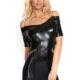 Zniewalająca i ekstrawagancka zarazem sukienka z błyszczącego wetlook-u wykończona lakierowanym vinylem. Uroku całości dodają ramiączka z pięknego, złotego łańcuszka oraz duże, złote koła na kieszonkach.