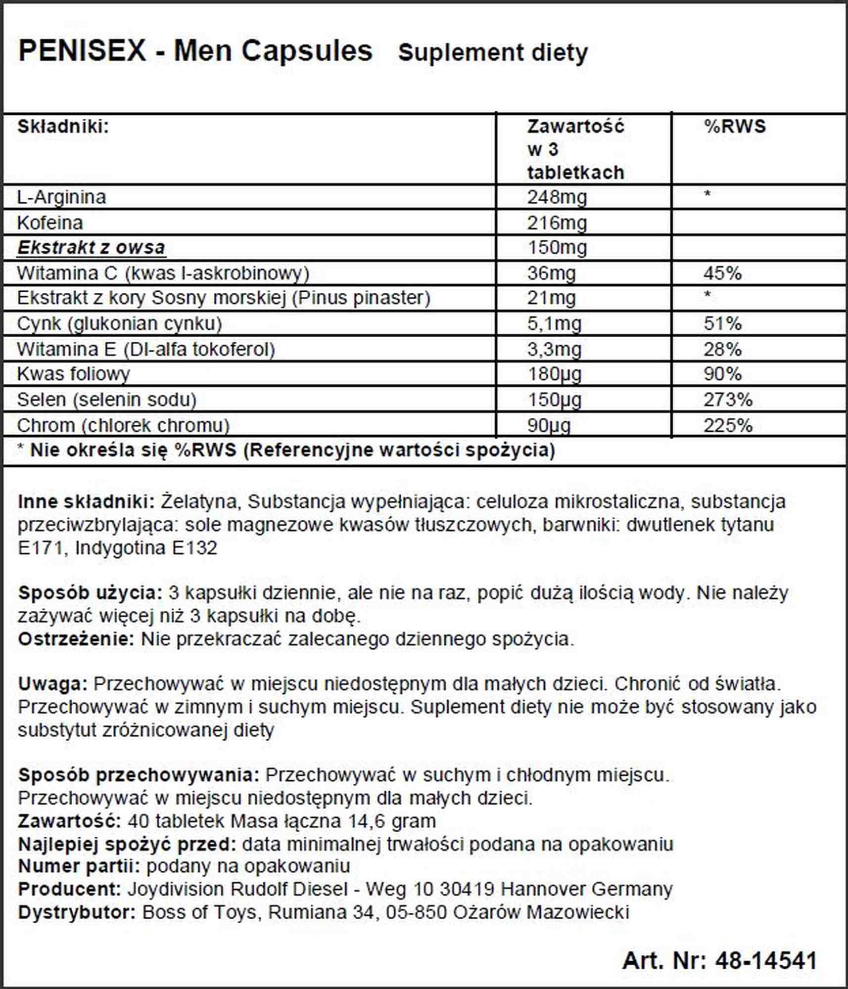 Znany i ceniony producent JoyDivision opracował i zoptymalizował formułę kapsułek do wymagań mężczyzn tak, aby kapsułki były jak najbardziej skuteczne.