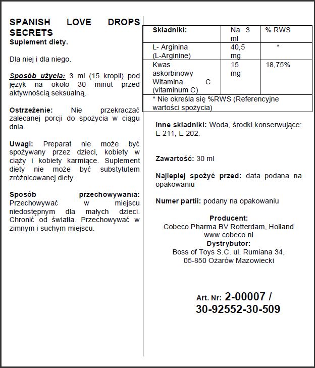Spanish Love Drops Secrets to silniejsza koncentracja niż oryginalna hiszpańska mucha, więc przygotuj się na noc dzikich iskier! Ich zadaniem jest wspomóc pobudzenie popędu płciowego oraz zwiększenie odczucia podczas stosunku. Rozpali również zmysły osób oziębłych.