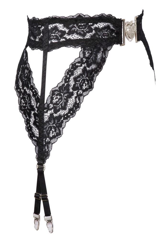Black lace suspender belt from Cottelli LINGERIE in a stylish cut with silver-coloured details. Made entirely from fine black lace – soft and stretchy for a high level of comfort. Decorative glitter heart clasp at the front. Each side has a glitter ring and 2 adjustable suspender straps.