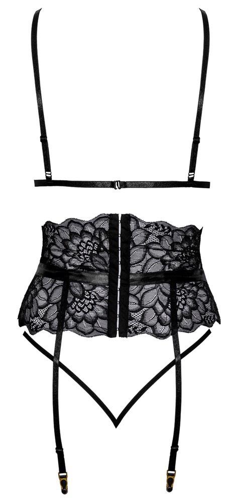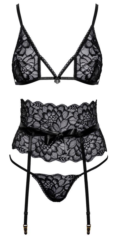 Wireless bra, suspender belt & string made out of delicate black lace in an elegant set from kissable. All pieces are soft and stretchy for a comfortable fit. The stylish bra has a hook fastener at the back and adjustable straps. The suspender belt emphasises the waist area and has eye-catching satin straps that can be tied together in front of the waist. It has hook fasteners at the back and the suspender straps can be adjusted. The seductive small string has two narrow stretchy straps that come together in the crotch area.