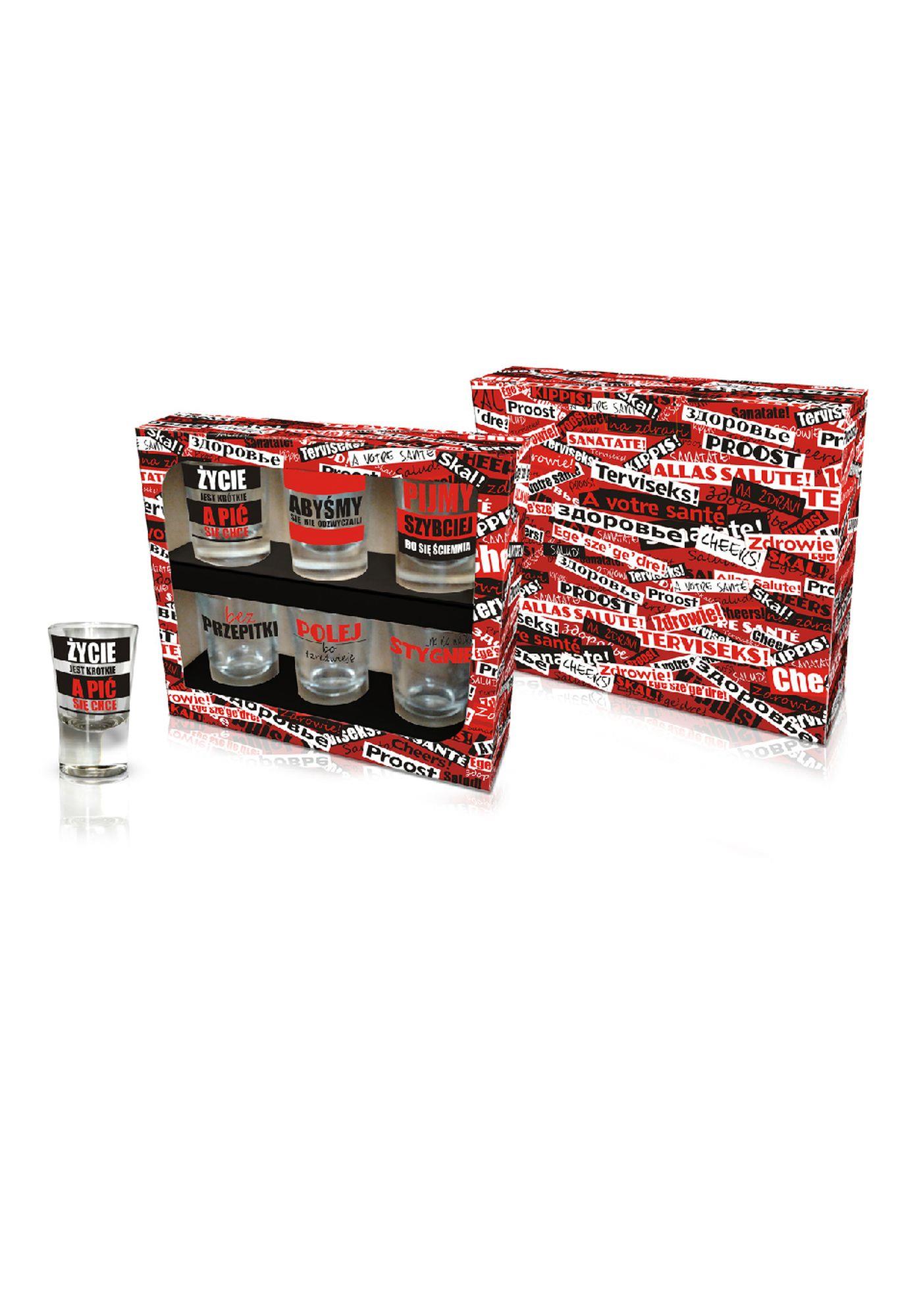 Zestaw 6 kieliszków to idealny gadżet na rozkręcenie domowej imprezy. Zaskocz swoich gości, podając trunek w kieliszkach zdobionych śmiesznymi toastami. To gwarancja dobrej zabawy! Każdy kieliszek zdobiony jest innym napisem, dzięki czemu, zawsze wiadomo do której osoby należy. Zapakowane w kolorowe pudełko, pięknie się prezentują. Idealny gadżet na pomysłowy prezent! Zdobienia: Życie jest krótkie a pić się chce, Abyśmy się nie odzwyczaili, Pijmy szybciej bo się ściemnia, Bez przepitki, Polej bo trzeźwieję, Stygnie