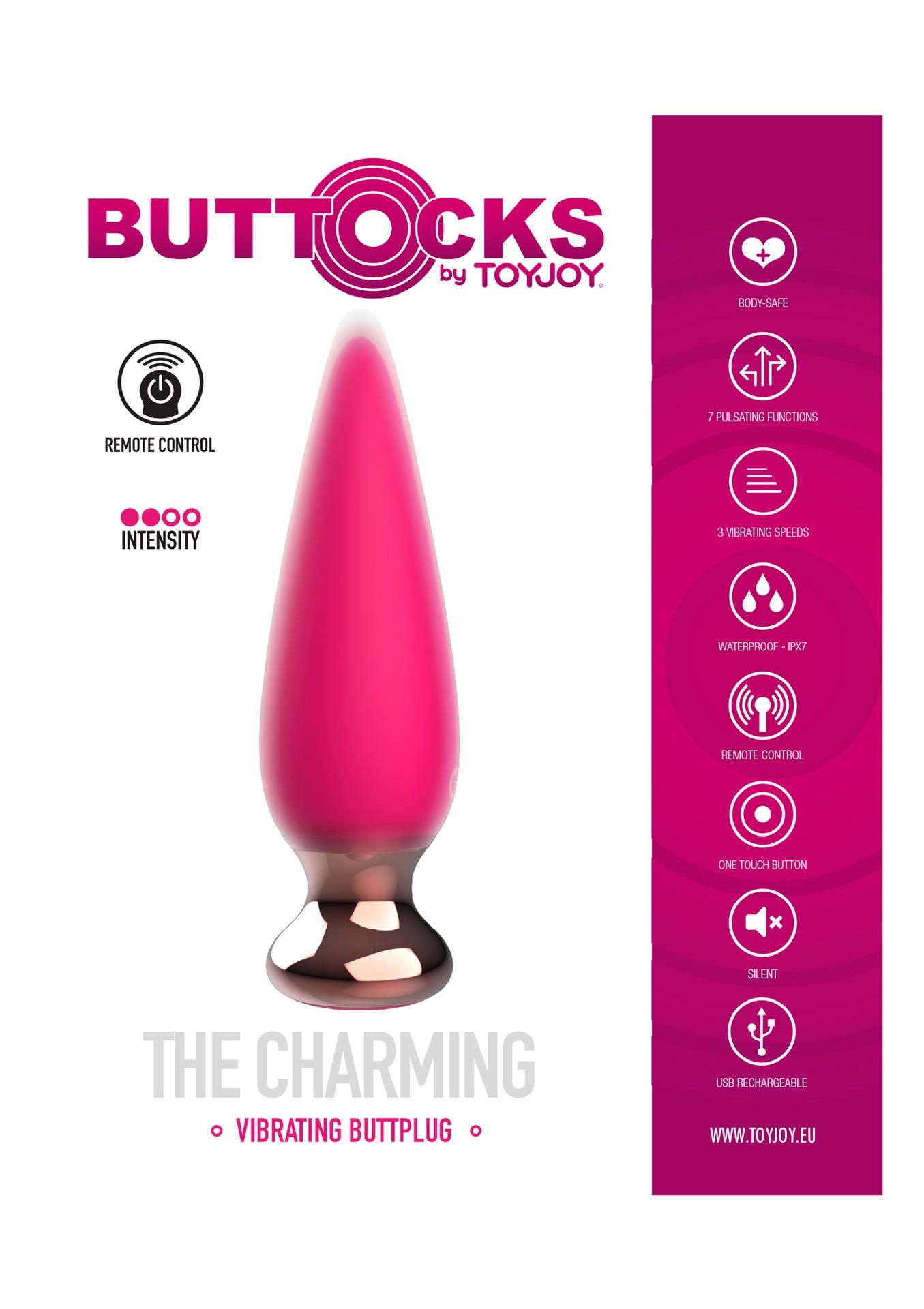 Charming to wibrujący, mroźny różowy butt plug, posiada mocny silnik z 7 różnymi trybami wibracji i 3 prędkościami wibracji. Każdy tryb oferuje głębokie dudniące wibracje, które są łatwo kontrolowane na elemencie lub za pomocą dołączonego pilota. Buttocks by TOYJOY to linia wysokiej klasy korków do stymulacji analnej, stworzonej z wieloma specjalnymi cechami, aby zwiększyć przyjemność analną. Buttocks by TOYYJOY jest doskonałym wyborem dla następnego poziomu stymulacji analnej.
