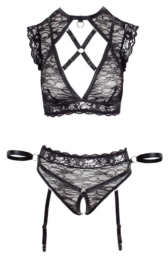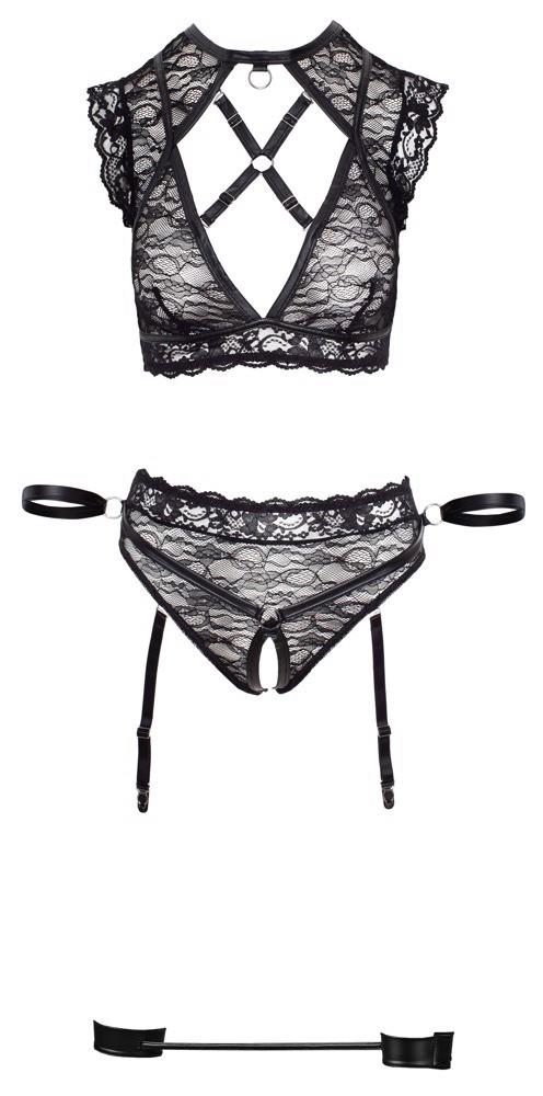 Top i spodenki do szelki ouvert wykonane z miękkiej elastycznej koronki z ekscytującymi matowymi detalami. Kajdanki, które są dołączone do majtek, jak również dołączone mankiety na kostkę zapewniają zniewalające chwile pożądania. Wszystkie mankiety są wyposażone w praktyczne zapięcie na rzep. Na górze znajduje się sprytnie wycięty dekolt, który jest wyposażony w regulowany i odpinany krzyż paska. Na szyi znajduje się mały pierścionek, na którym można zaczepić np. smycz (nie dołączona). Majtki są zapraszająco otwarte w kroczu. Regulowane szelki można zdjąć z majtek.