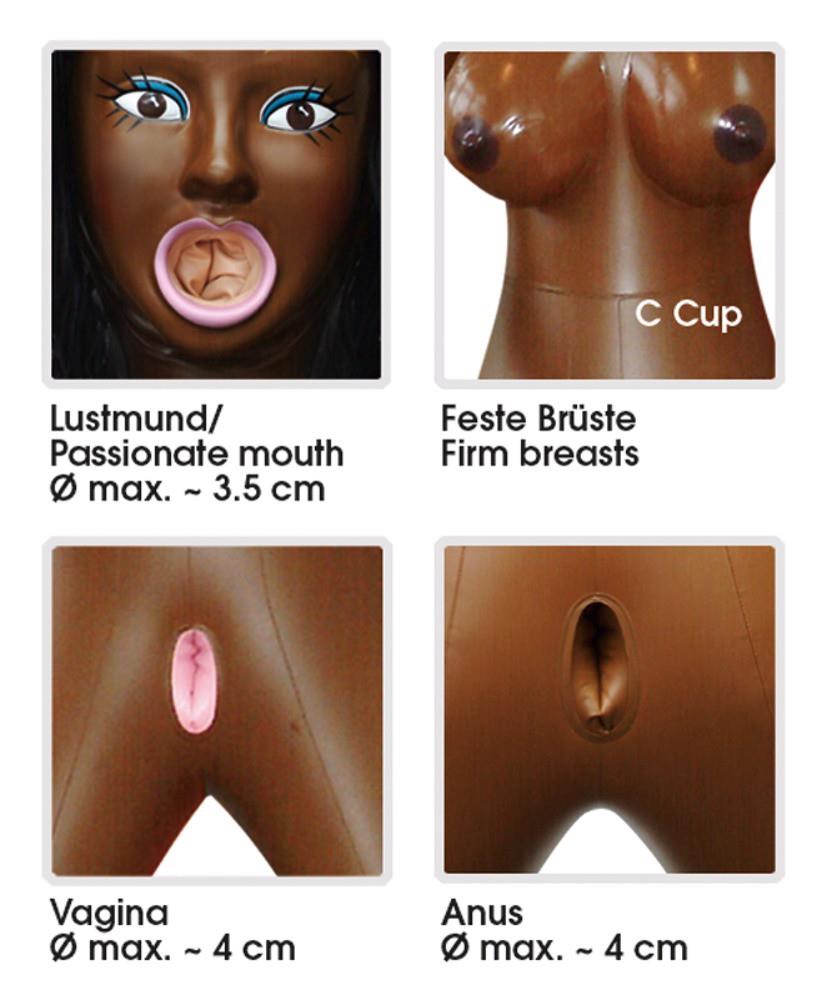 Ta lalka miłości urzeka swoimi 3 ciasnymi otworami miłosnymi i uroczo wyglądającą twarzą 3D. Ciemna karnacja i sięgające ramion ciemne włosy czynią ją szczególnie atrakcyjną, a ramiona są wygięte do ciepłego uścisku. Jej duże piersi i rozłożyste nogi zachęcają do zmysłowych spotkań i pieszczot.