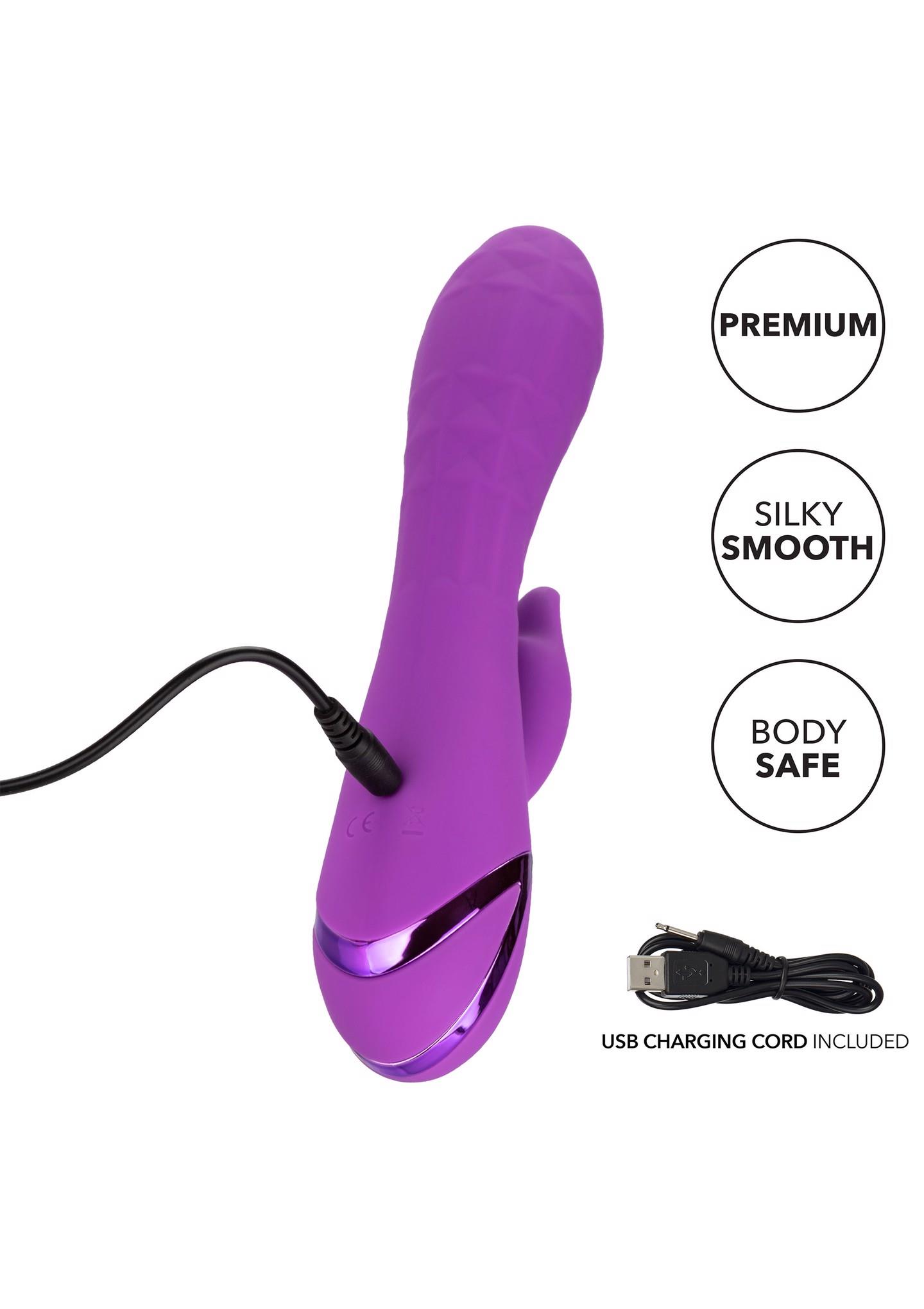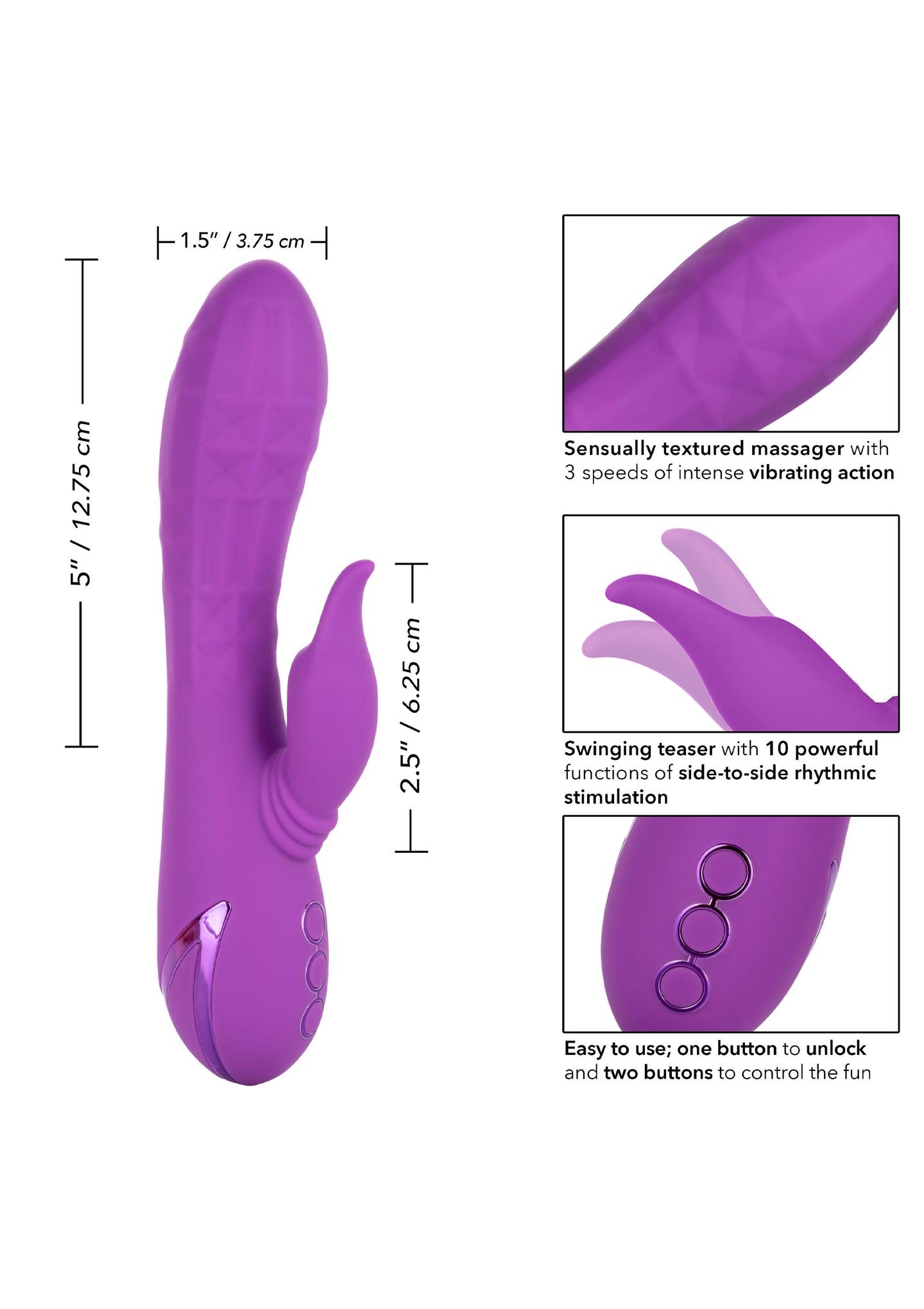Give yourself over the your wildest fantasies and indulge in true pleasure with the vivacious California Dreaming® Valley Vamp. The luxurious rabbit vibrator has a one-of-a-kind side-to-side rhythmic stimulator for mind-blowing external stimulation. Experience pleasure like never before with the unique swinging teaser and 3 speeds of shaft vibrations.Whether you’re looking to turn up the heat with a lover or just enjoy some sensual solo time, this ravishing massager is ready. The rhythmic side-to-side teaser functions deliver show-stopping clitoral stimulation while the contoured shaft indulges with deep rumbling vibrators. Control and customize your pleasure play with the independently controlled vibration and stimulator functions.Recharge the massager in 2.5 hours with the provided USB charging cable to enjoy 45 minutes of high-speed stimulation or 2.5 hours of low speed vibrations. Enjoy frustration-free control with the easy-touch 3-button control pad and security lock feature for travel-ready teasing. The virtually seamless body and self-sealing charging port allow you to get this versatile waterproof vibe for a dip. The hypoallergenic premium silicone is body safe, unscented and phthalate free to keep you most sensitive spots, happy and healthy.