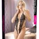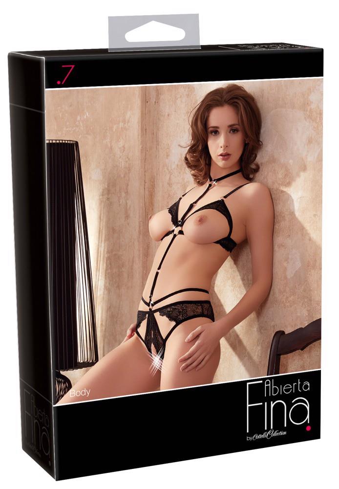 Czarny korpus pozwala Ci wyglądać głęboko, ponieważ składa się prawie wyłącznie z aksamitnych pasków, które nadają Twoim krągłościom elegancką ramę i są regulowane dla optymalnego komfortu noszenia. Piętro obramowane jest otwartymi miseczkami z delikatnej koronki, a otwarte majtki w kroczu również posiadają koronkowe wstawki. Dodatkowo wiele detali w złotym kolorze zdobi ciało, jak np. pierścionki dżetowe na szyi i majtki. 90% poliamid, 10% elastan.