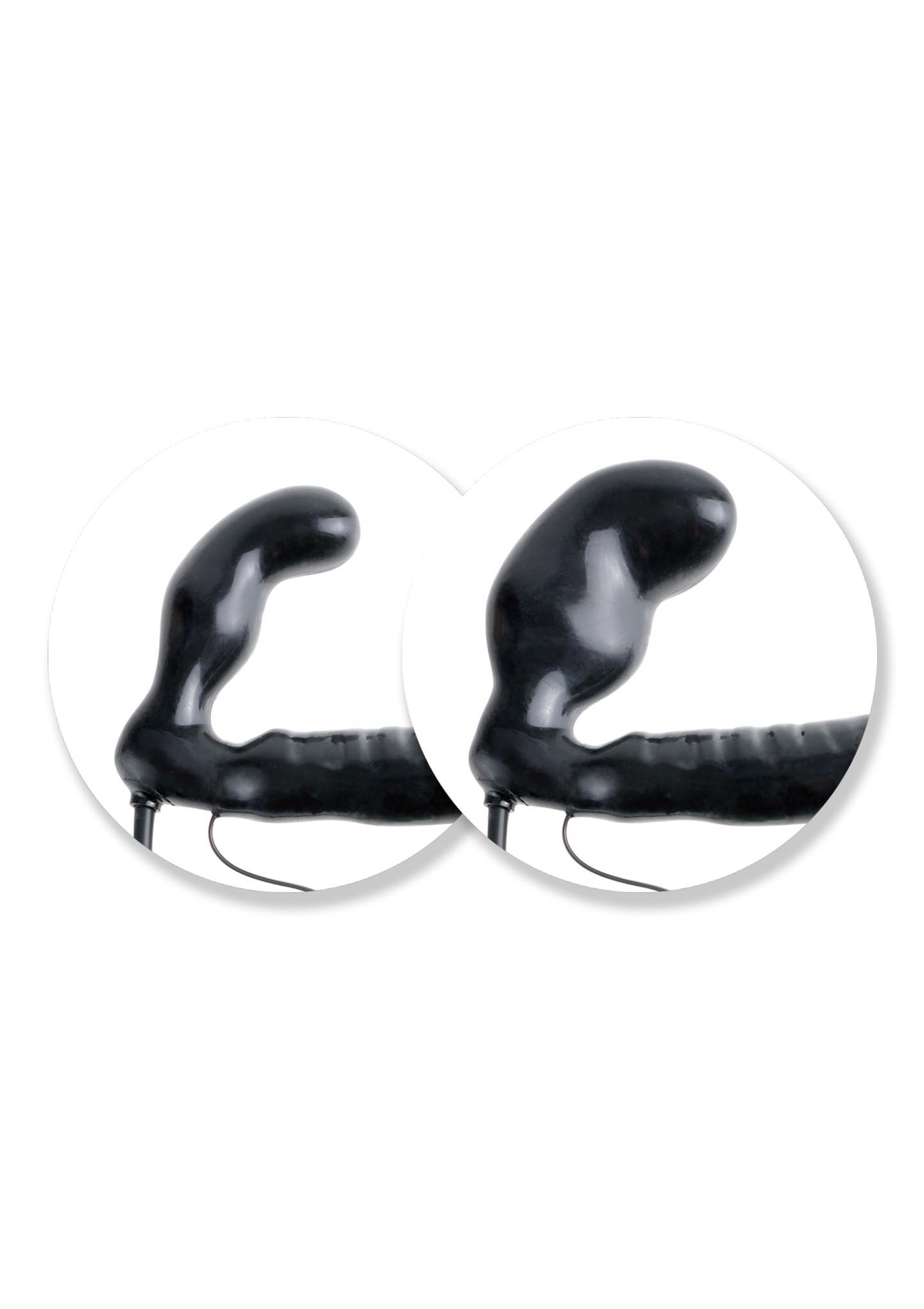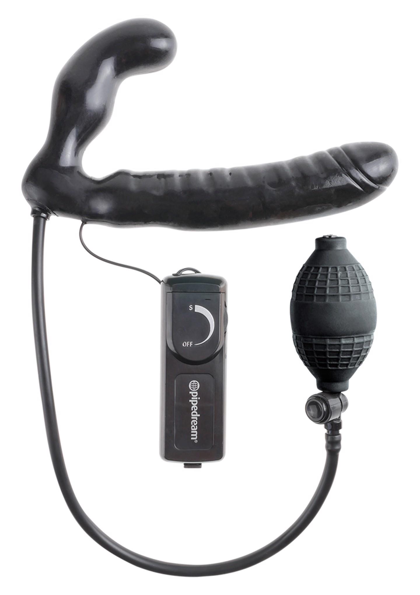 Get hands-free stimulation and hot face-to-face sex with the Inflatable Vibrating Strapless Strap-On. Cleverly curved at just the right angle, this strapless double dildo stays inside the wearer with each passionate thrust. The internal plug inflates using the medical-style ball pump, filling the wearer with thick stimulation and keeping the strap-on in place even when the action heats up. A powerful multi-speed bullet sends incredible vibrations through the entire