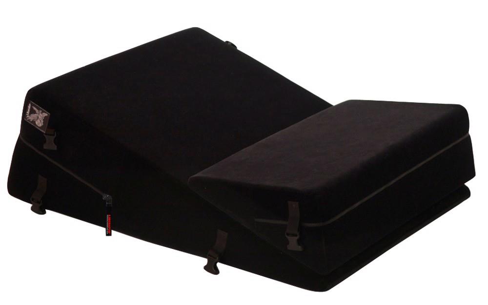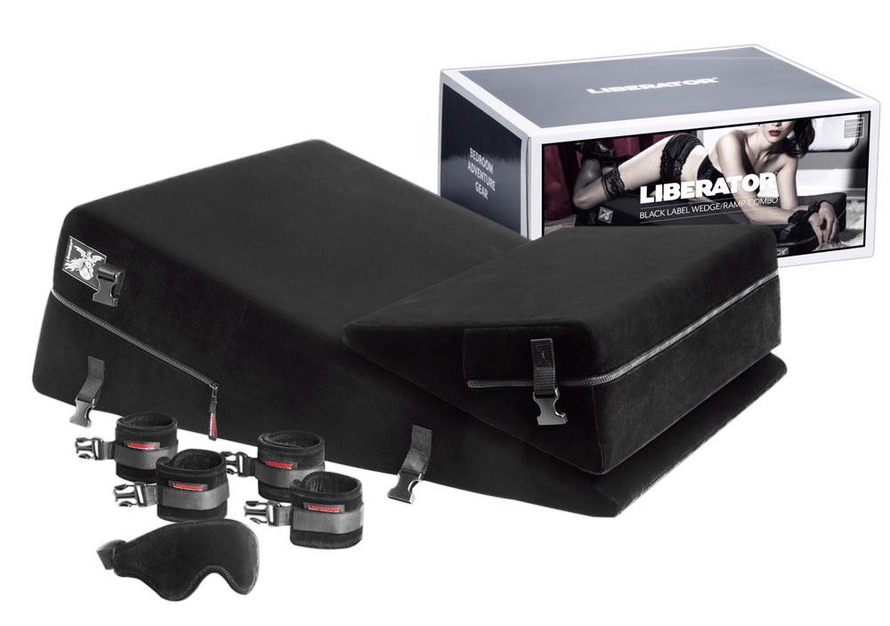 2 anatomicznie ukształtowane poduszki klinowe Zestaw klin/rampa Liberator plus 4 zdejmowane i regulowane pasy do krępowania rąk i stóp oraz maska na oczy w zestawie. Pokrycia poduszek z miękkiej mikrofibry przylegają do siebie i można je zdjąć z odpornego na wilgoć korpusu w celu wyczyszczenia.